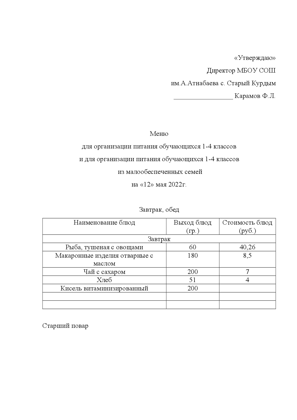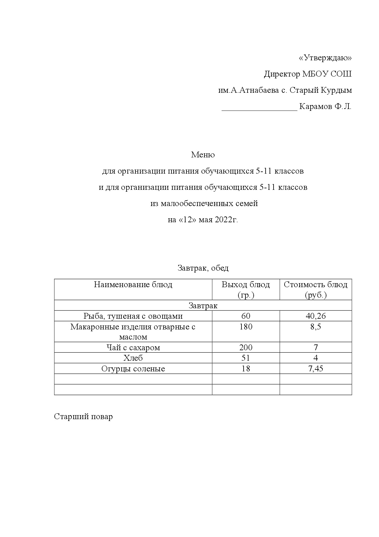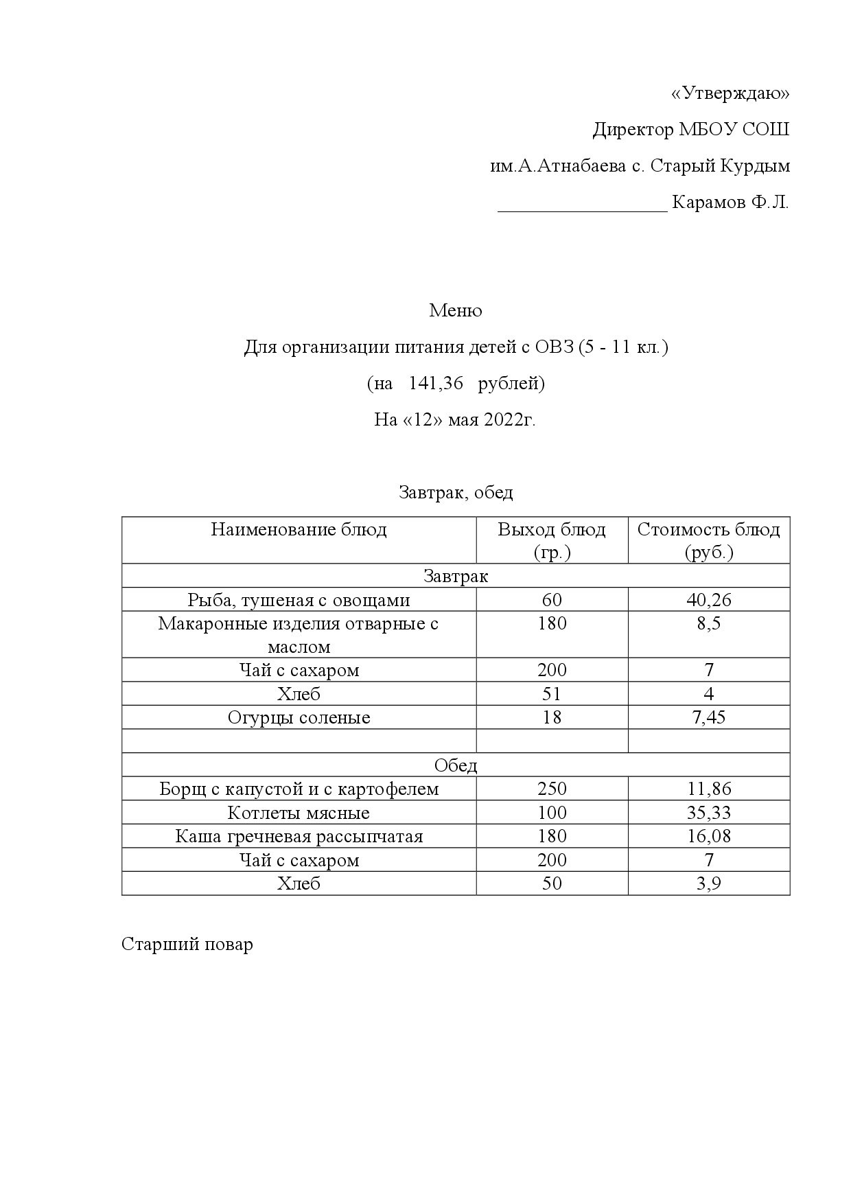 Стоимость школьного питания