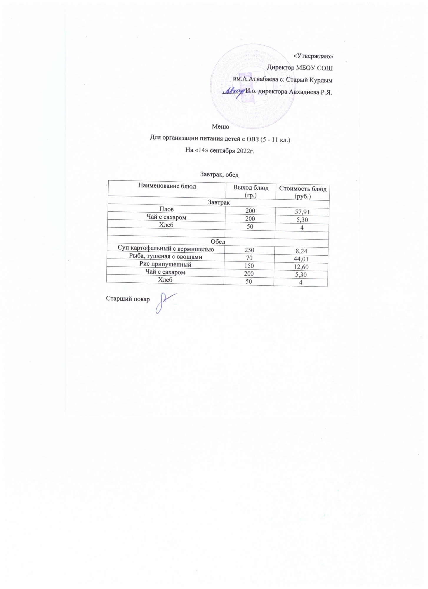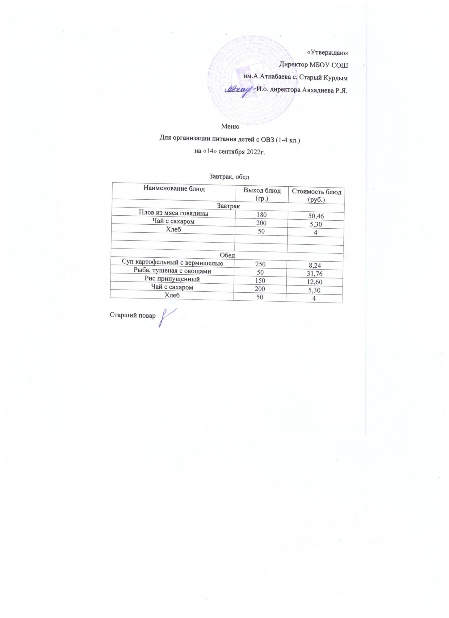 Примерное меню