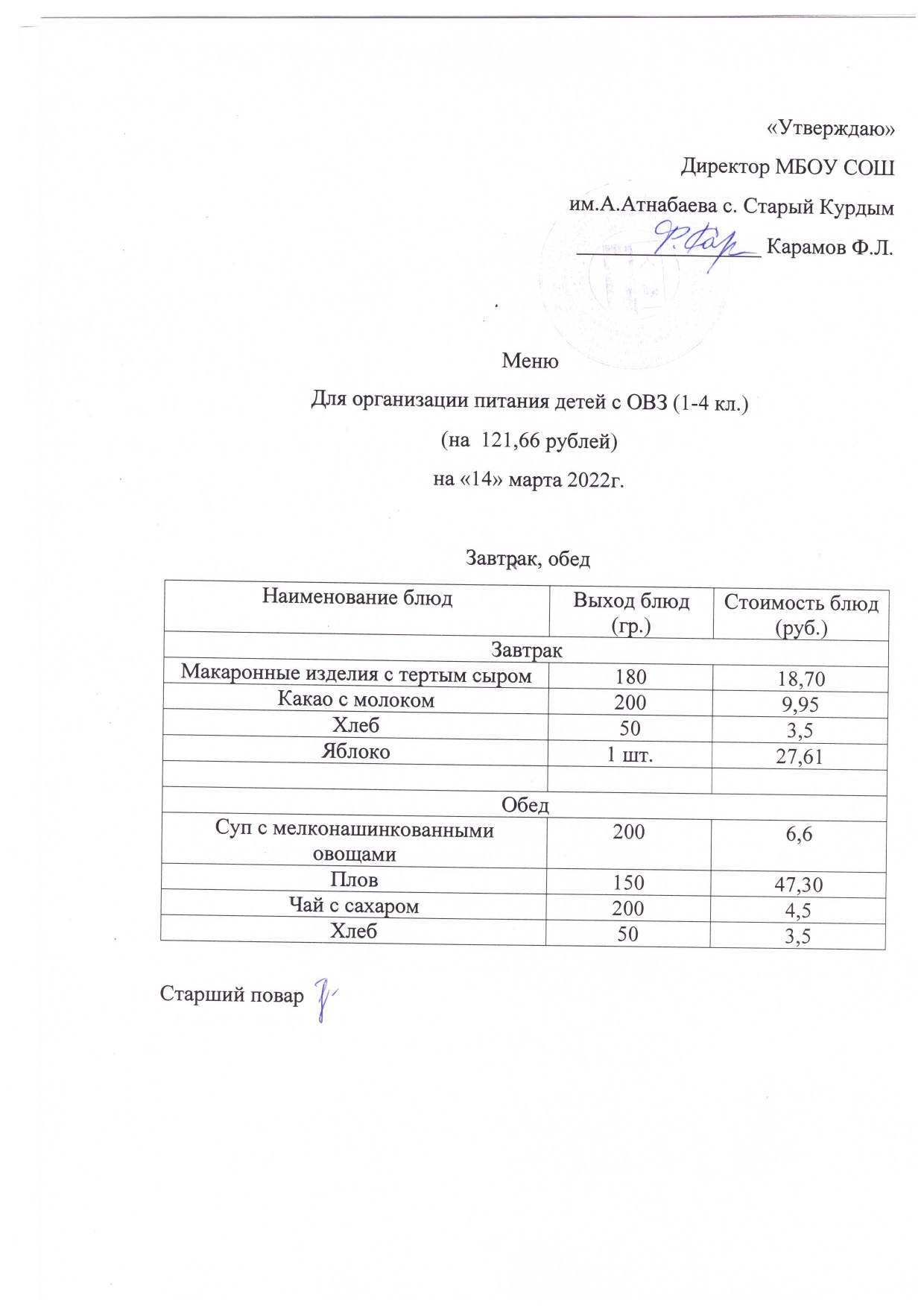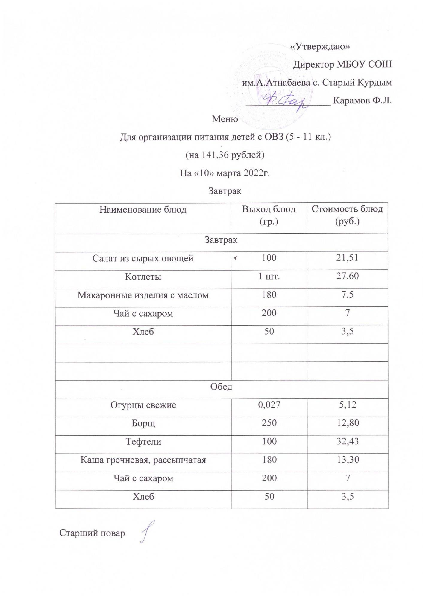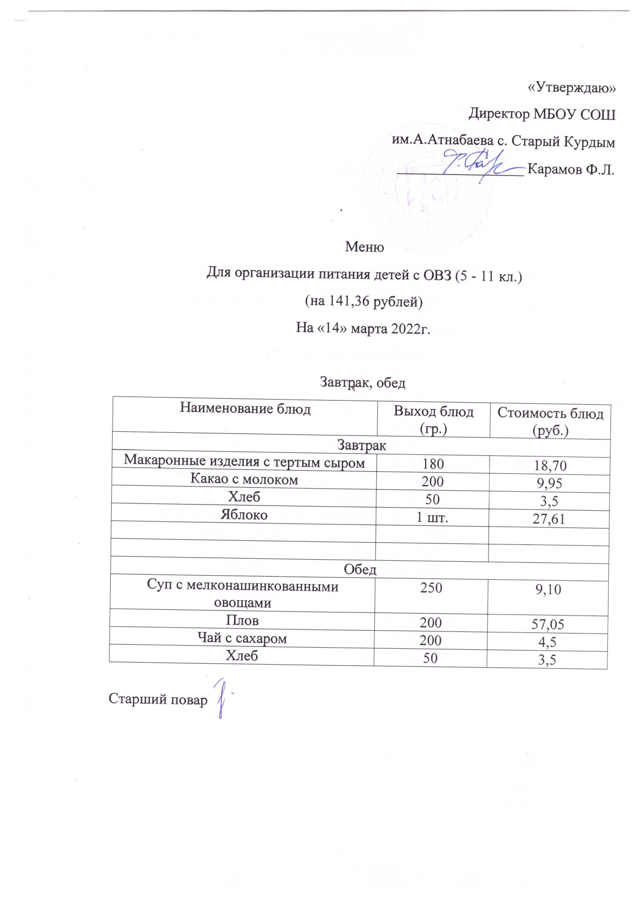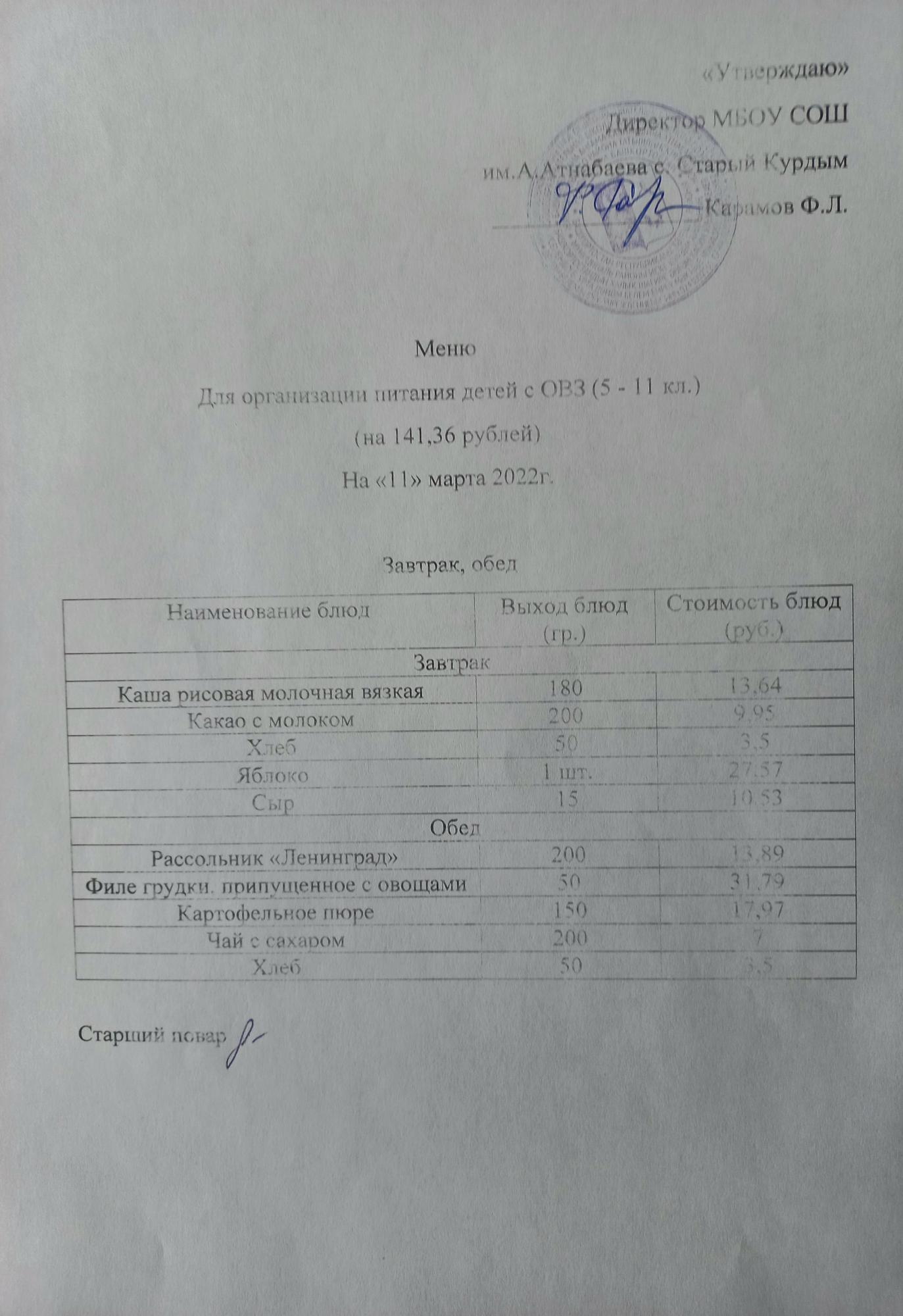 Стоимость школьного питания