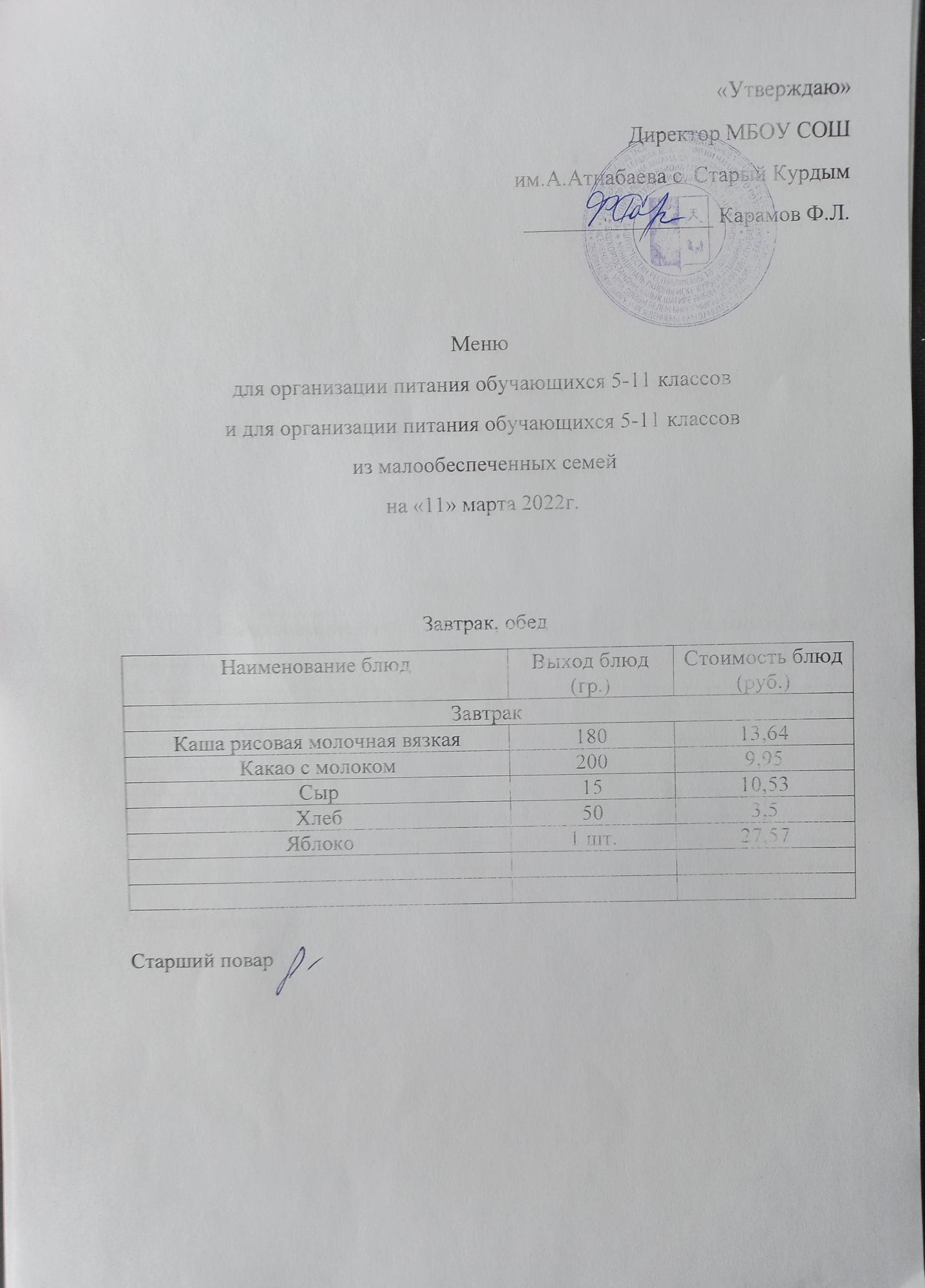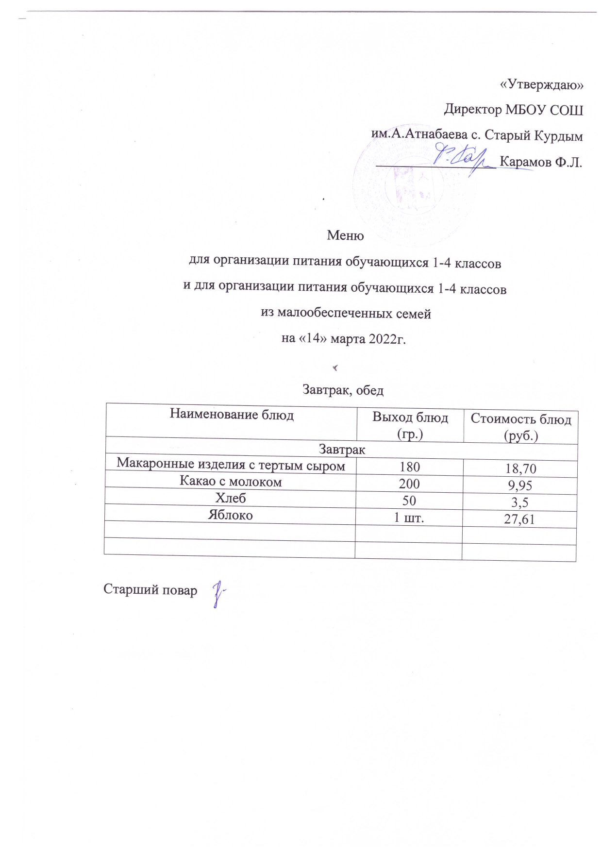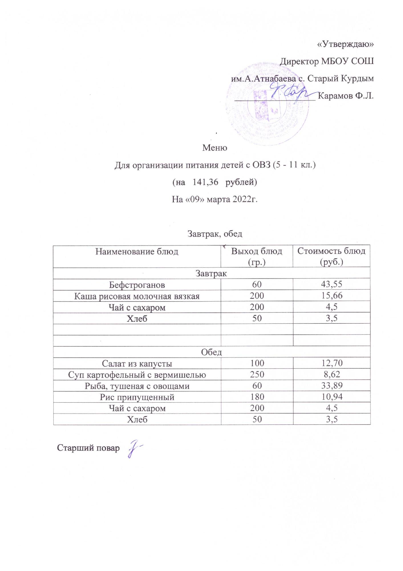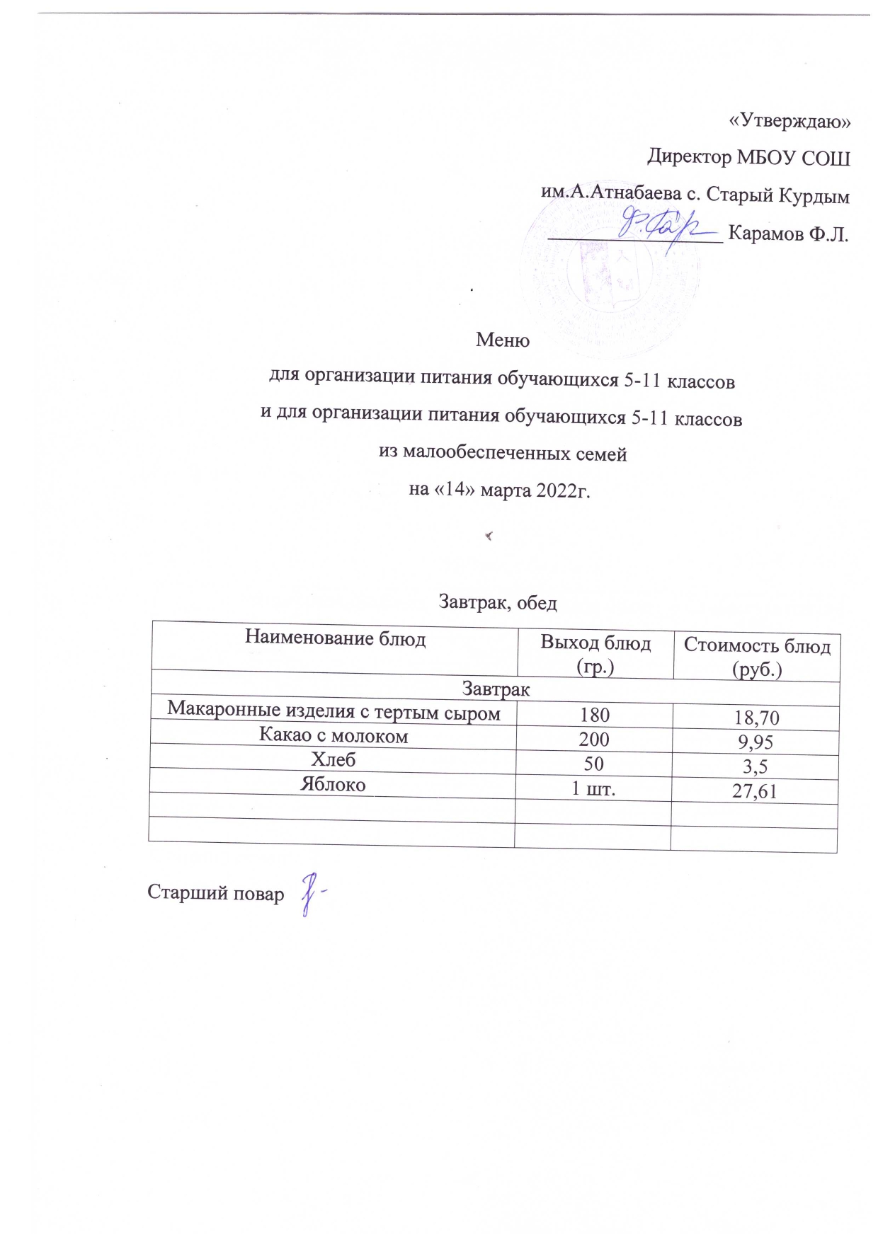 Стоимость школьного питания
