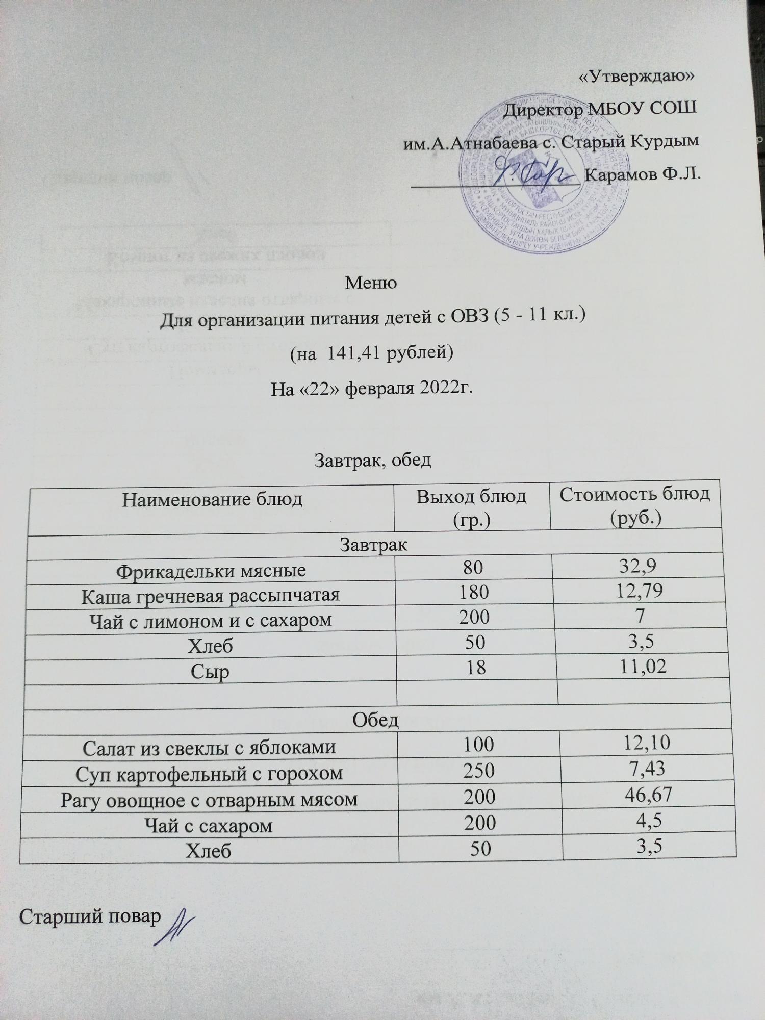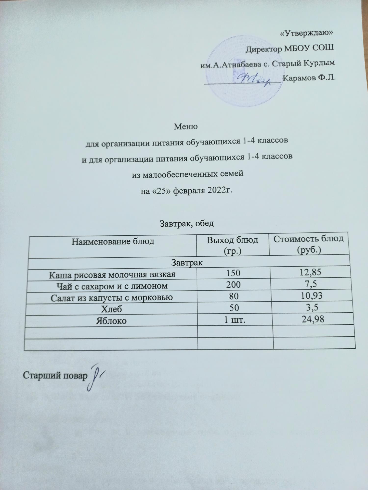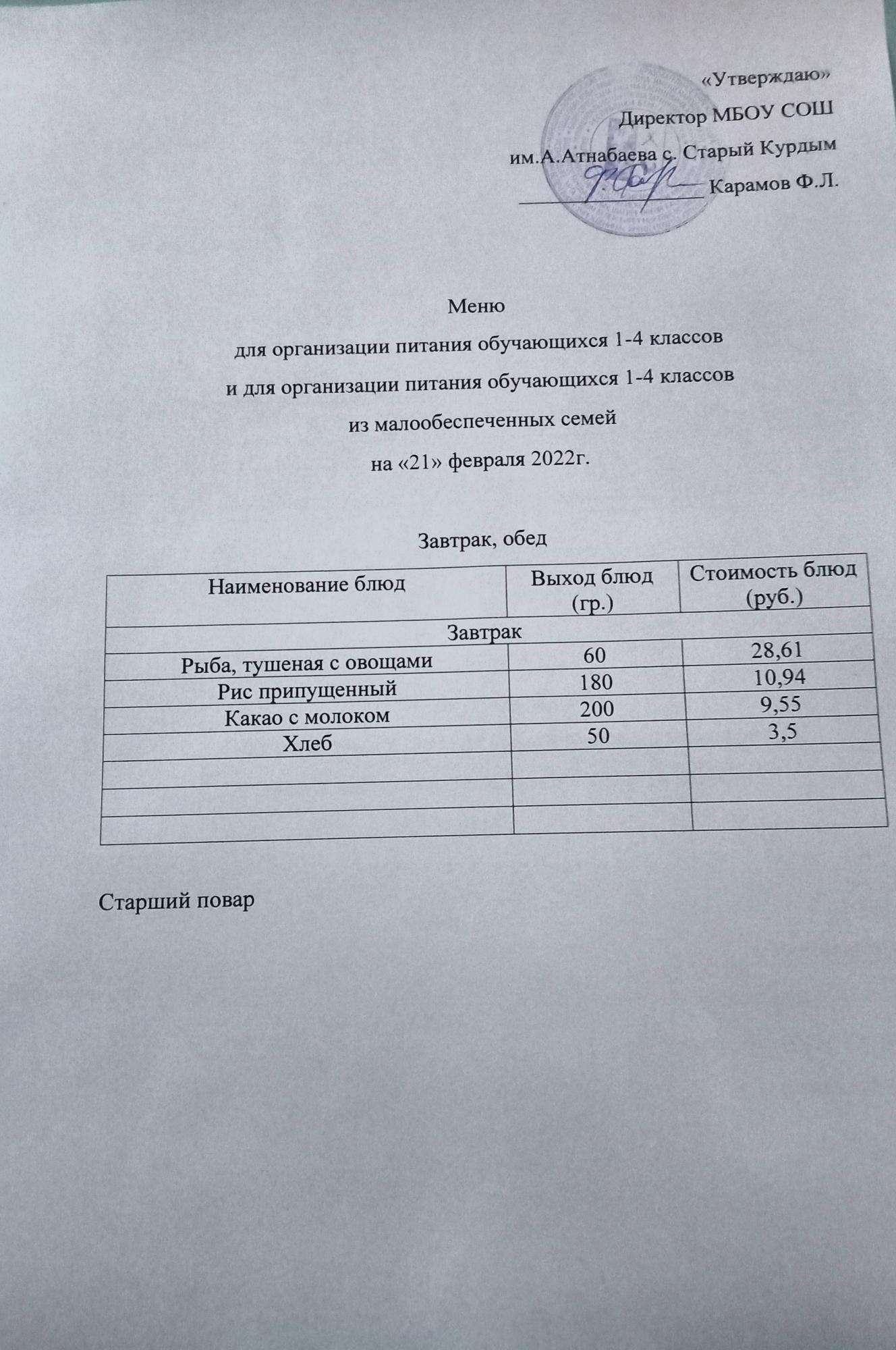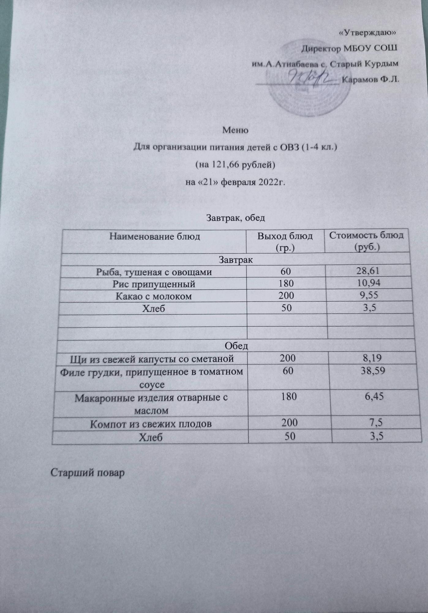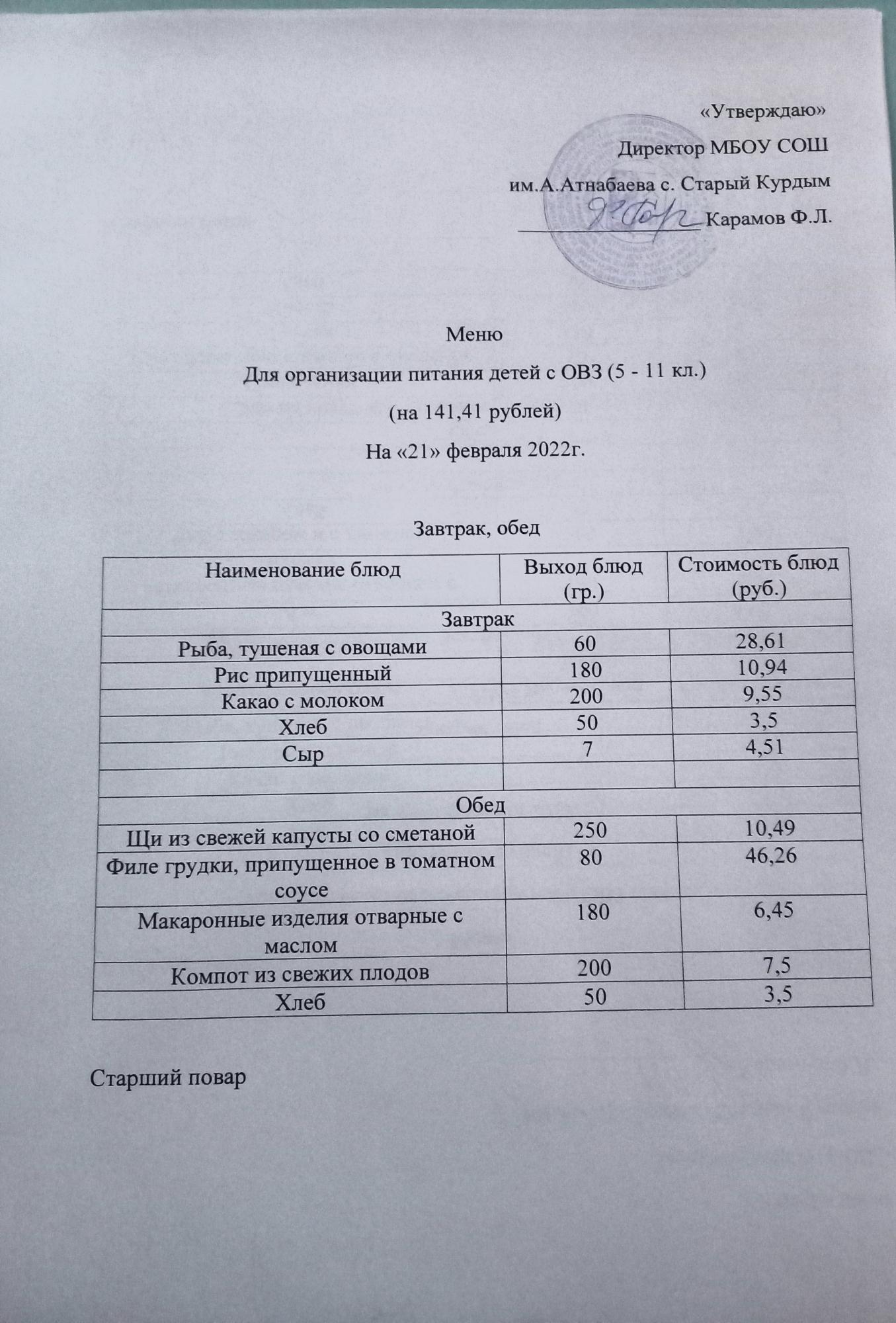Стоимость школьного питания