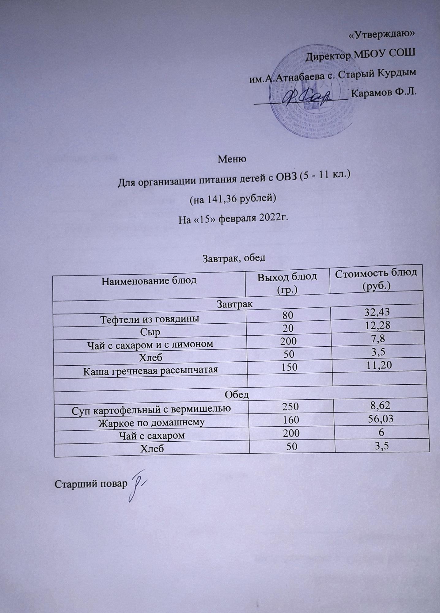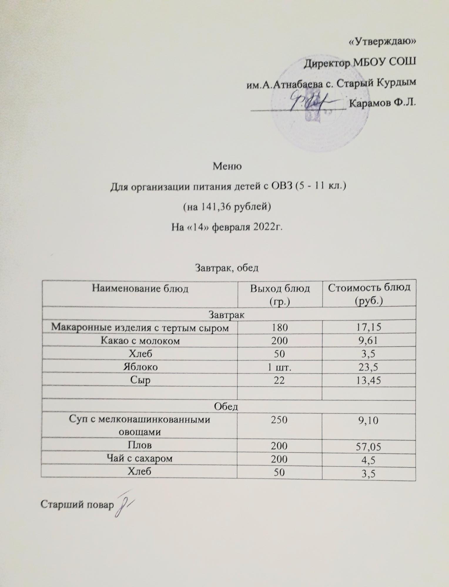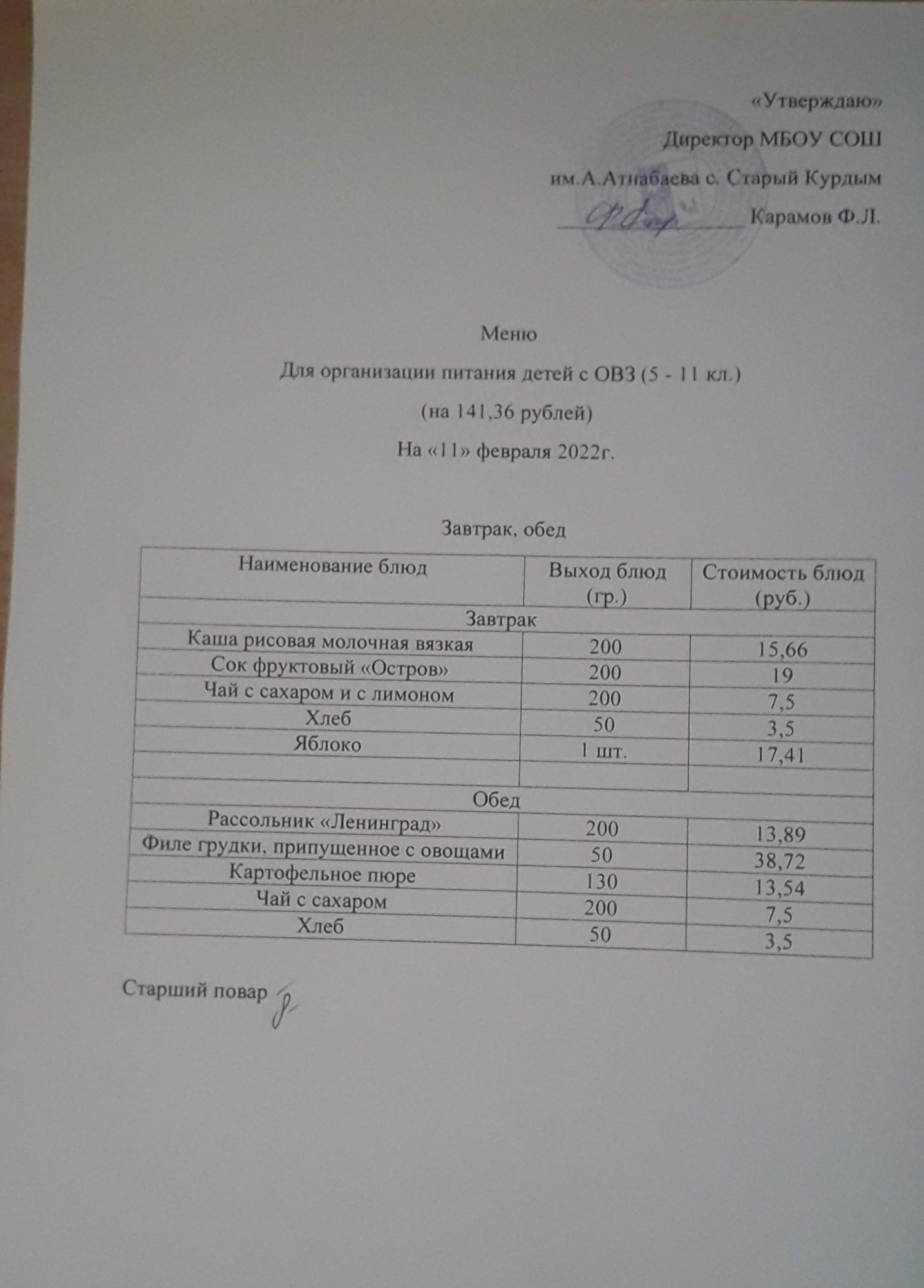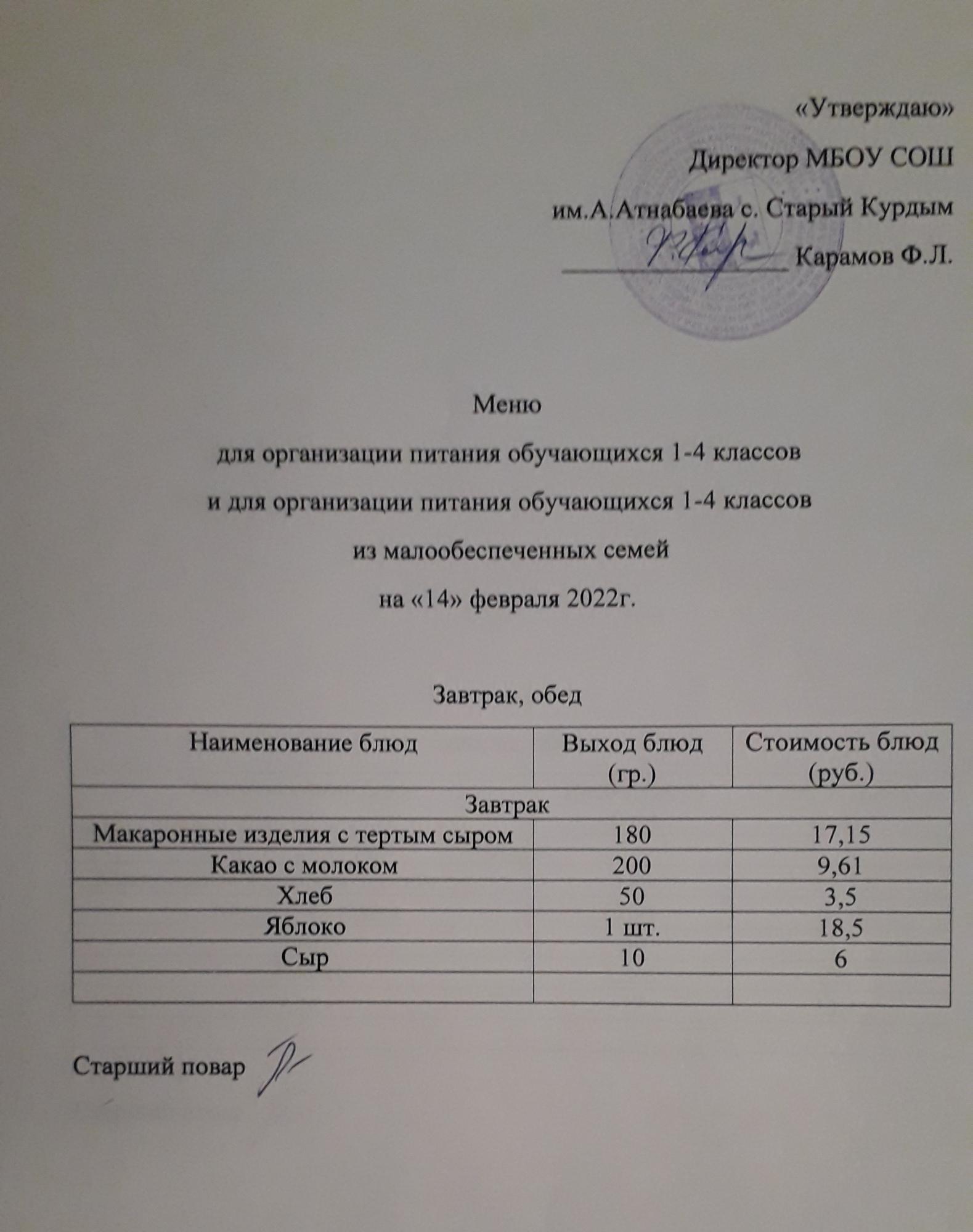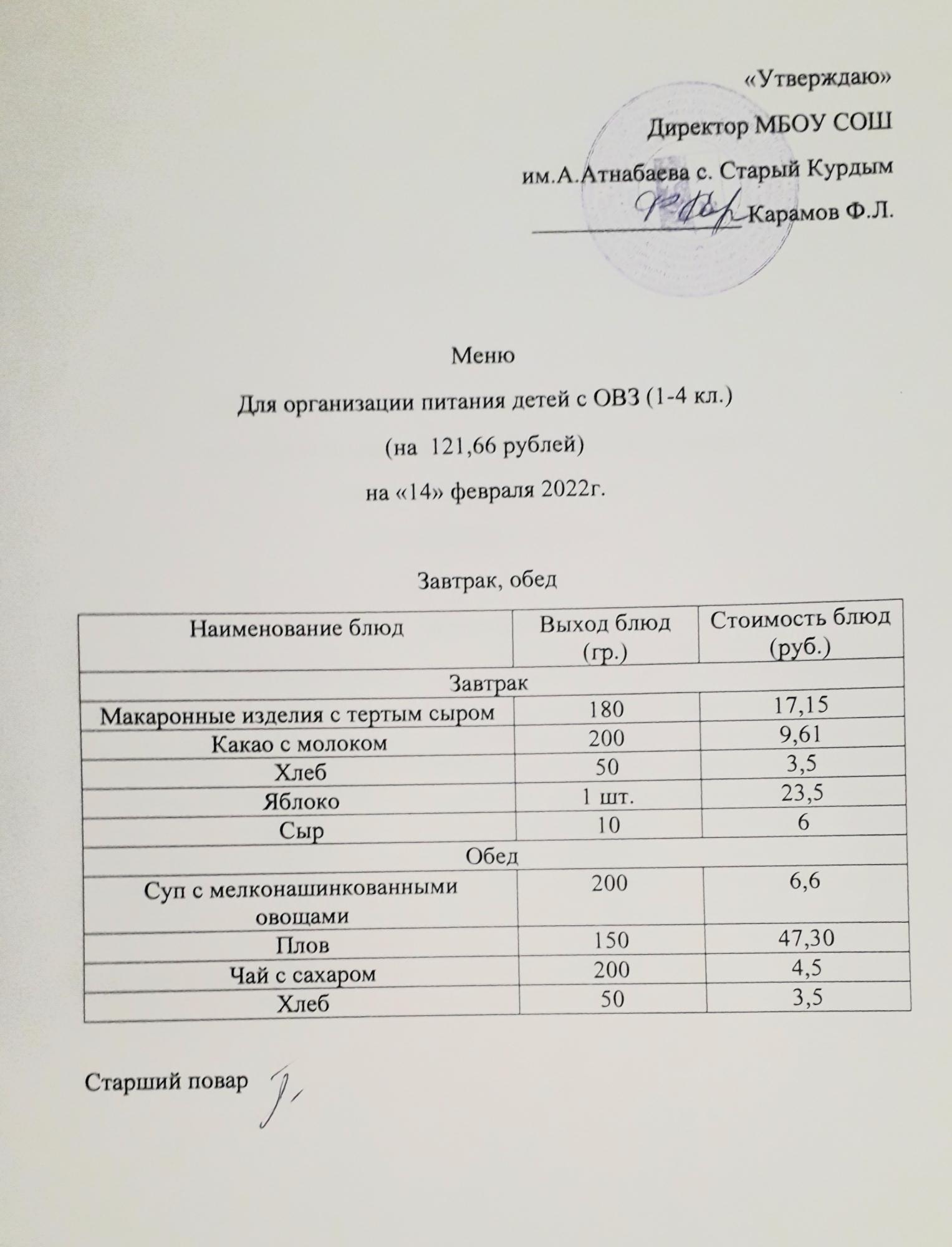 Стоимость школьного питания