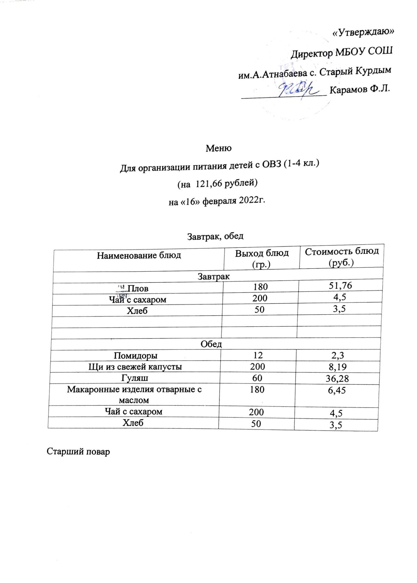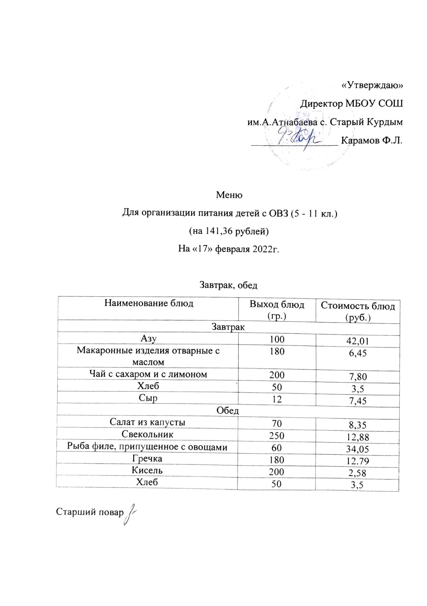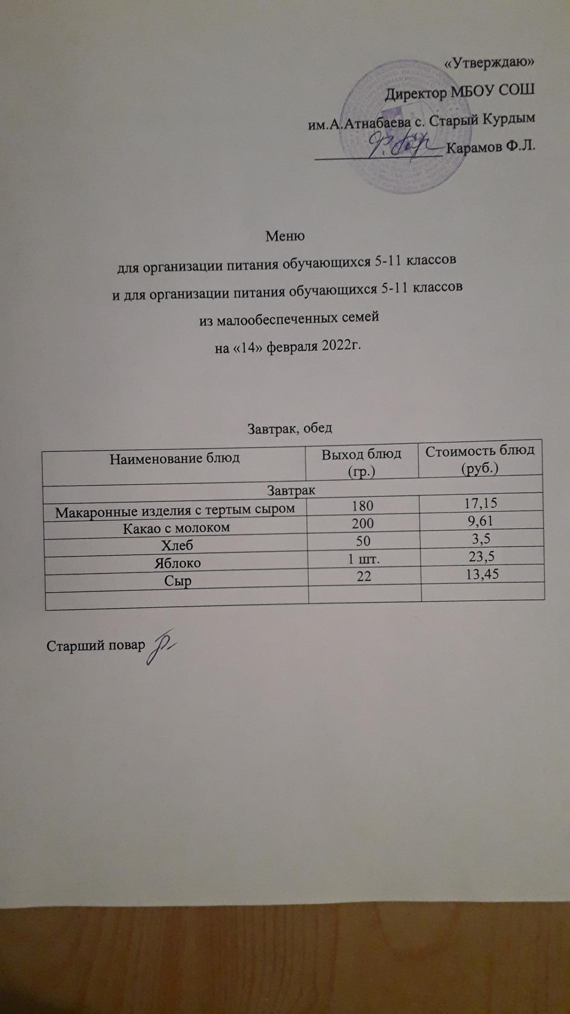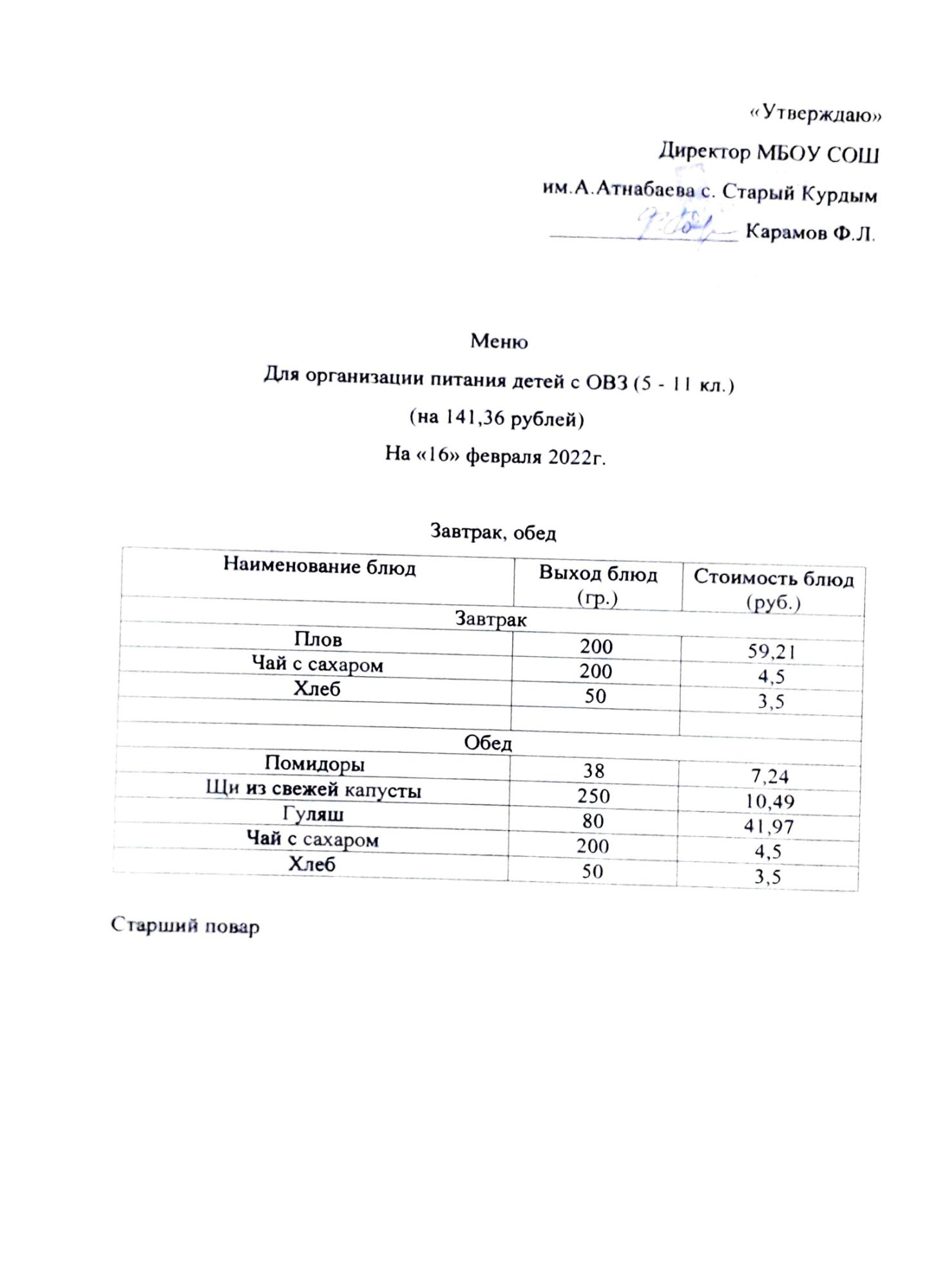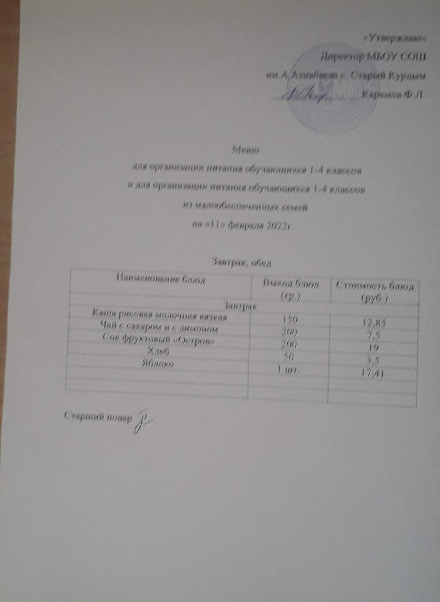 Стоимость школьного питания
