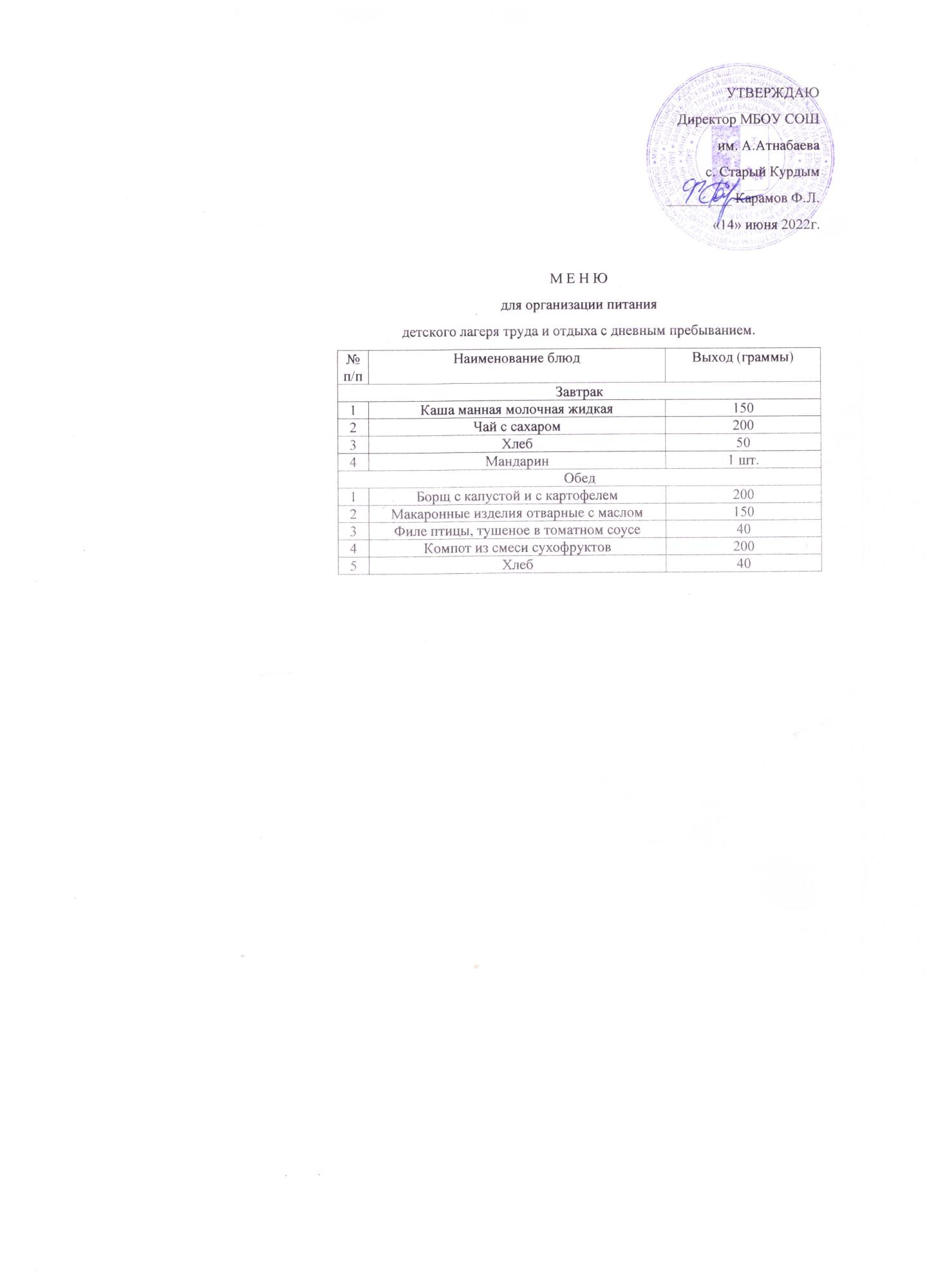 Примерное меню
