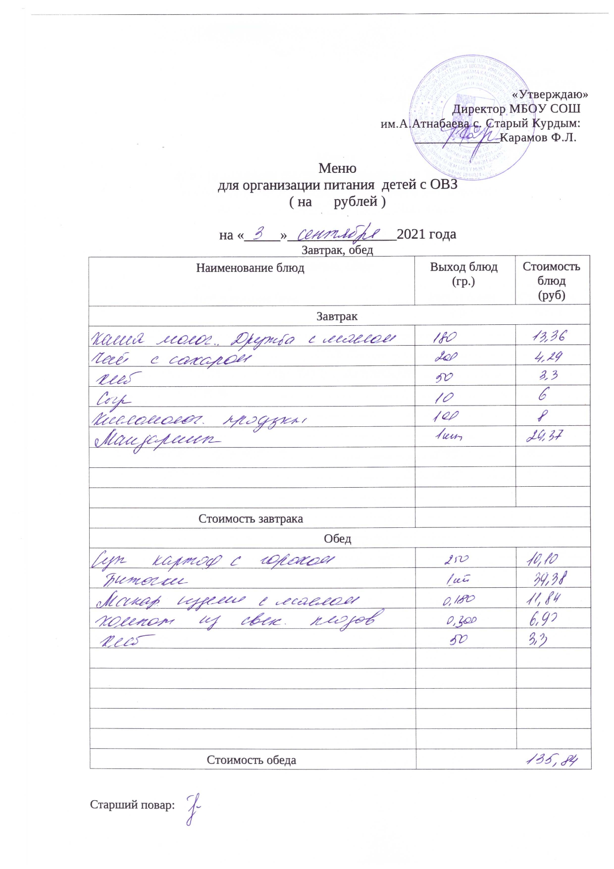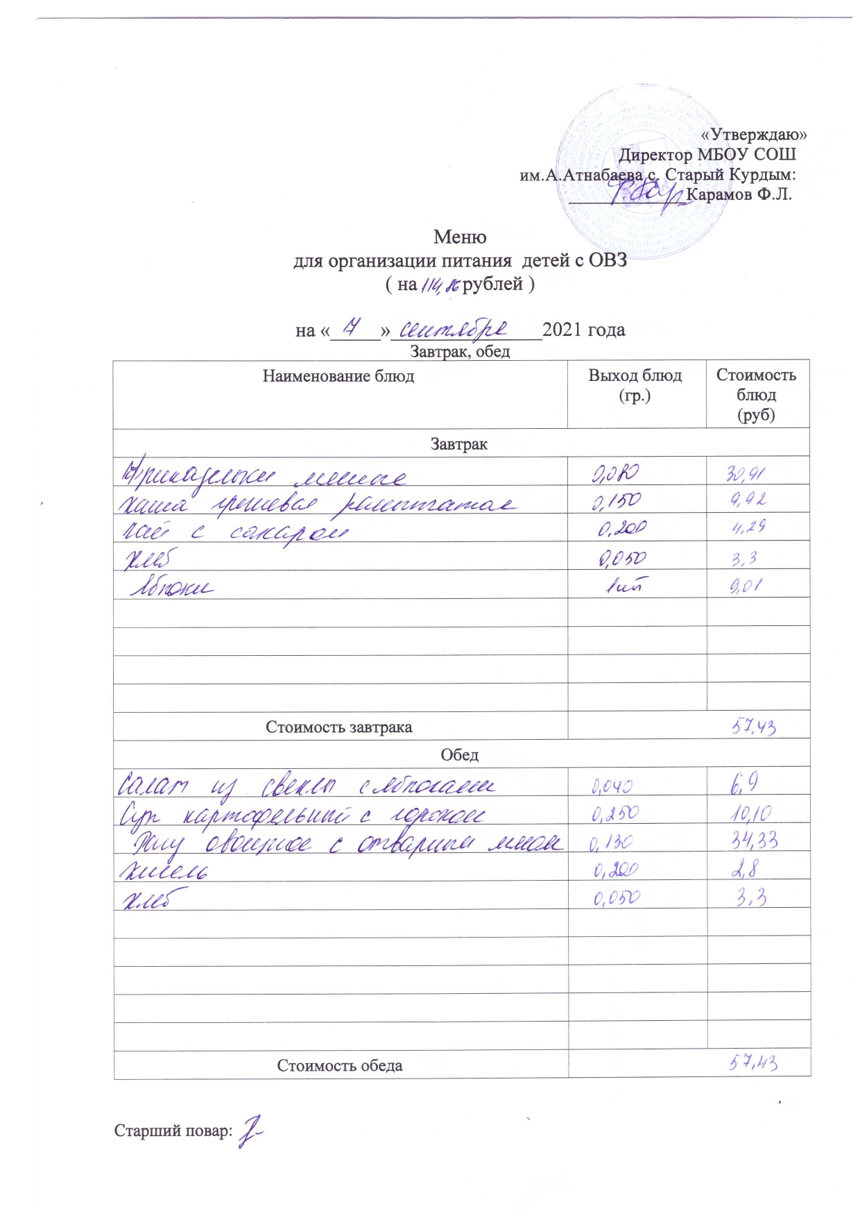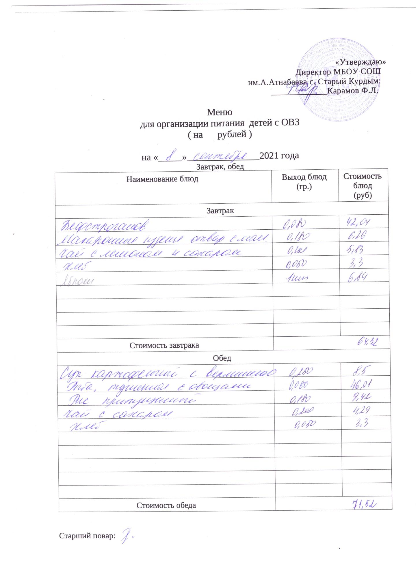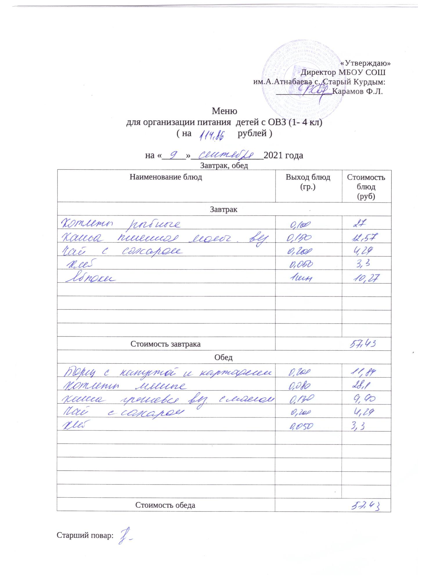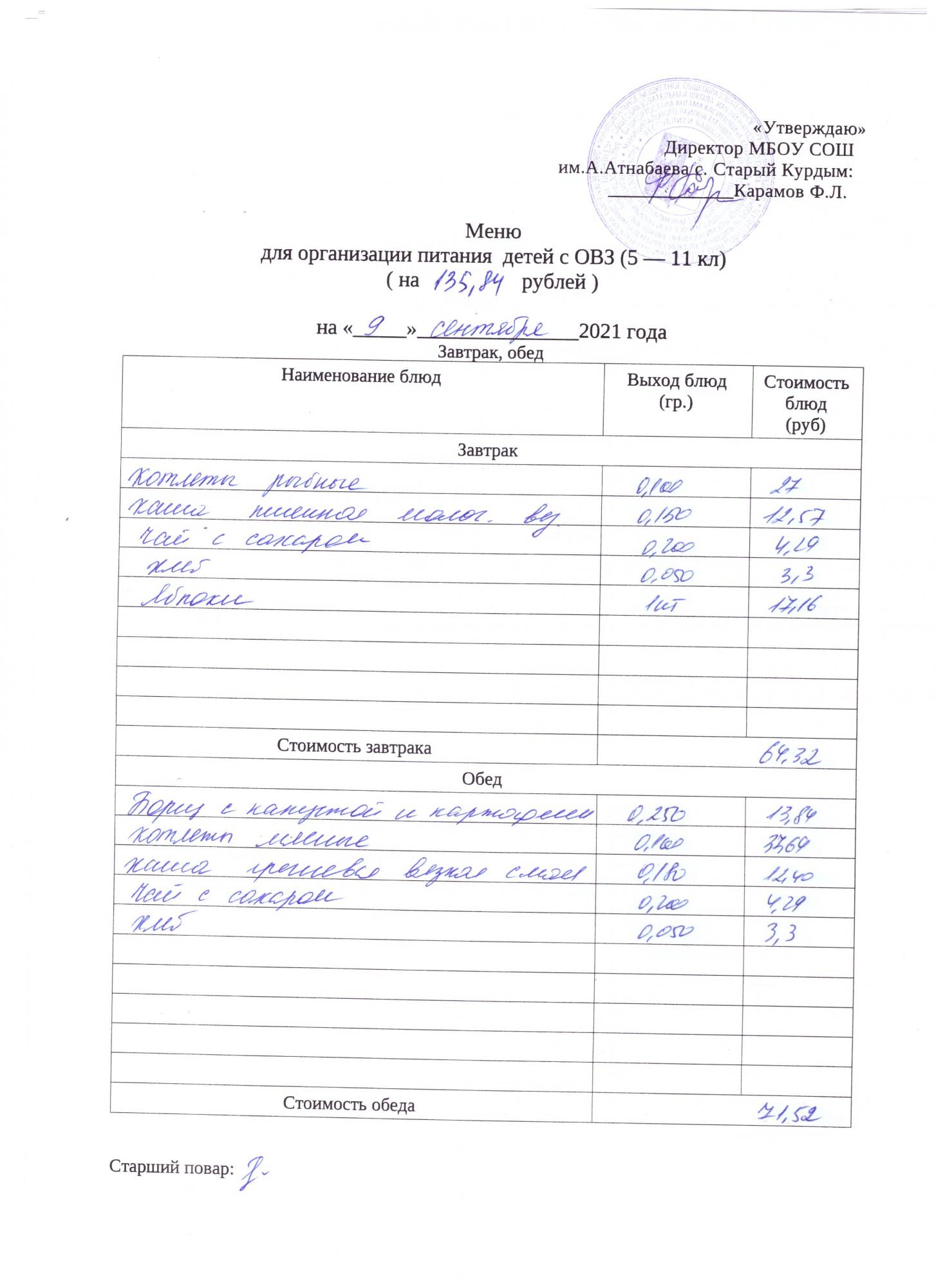 Стоимость школьного питания