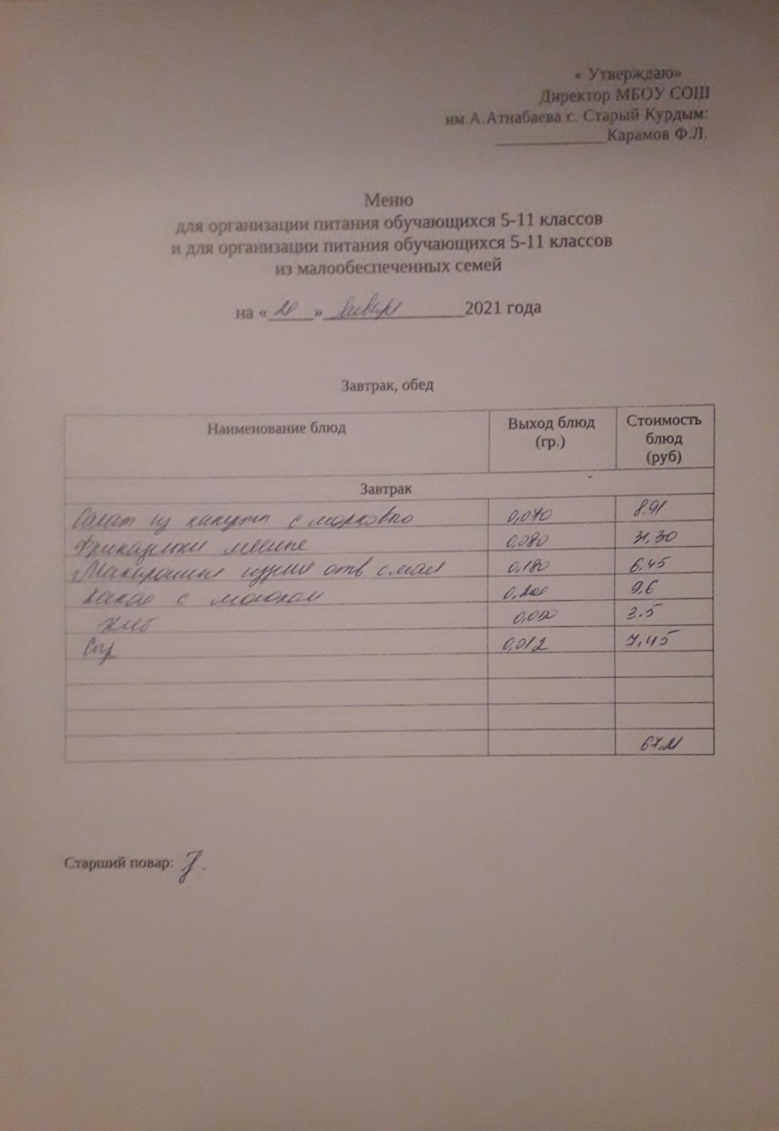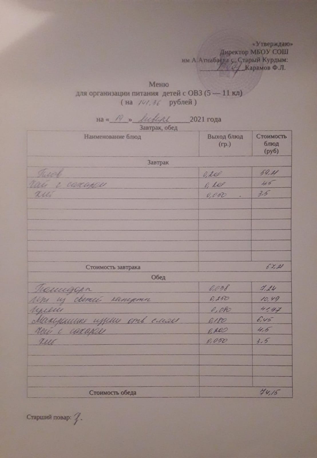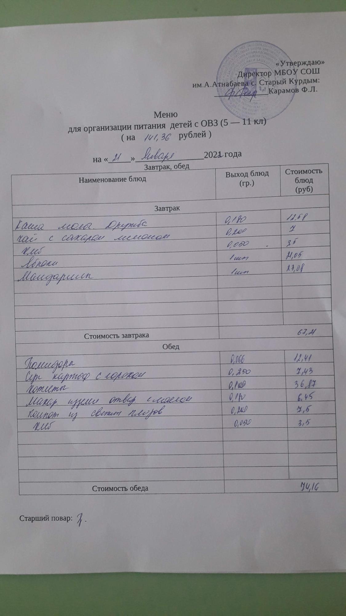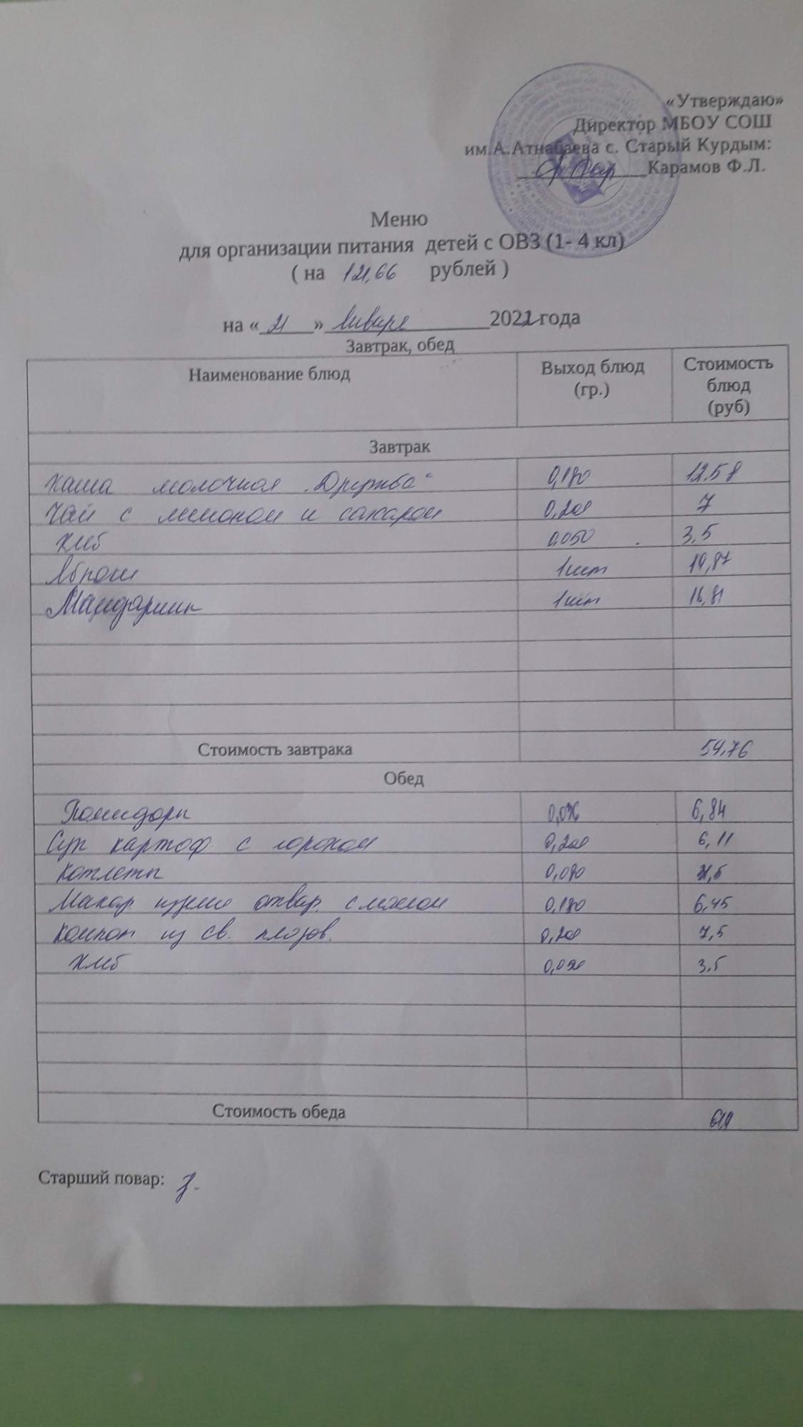 Стоимость школьного питания