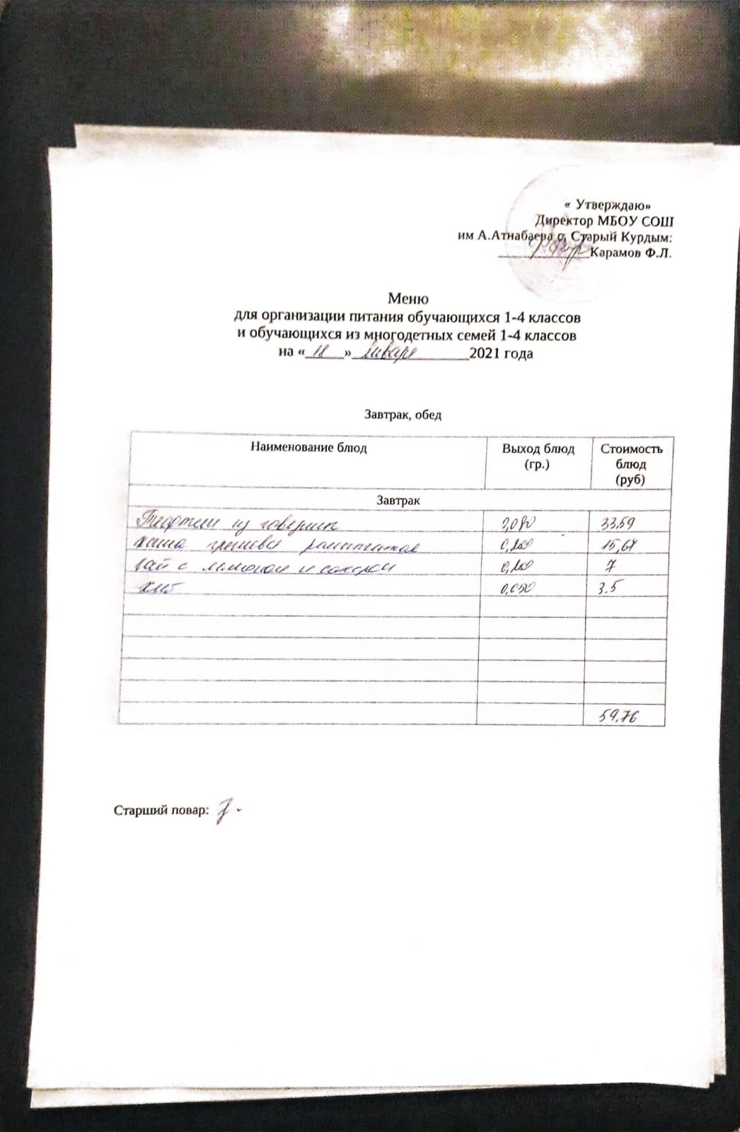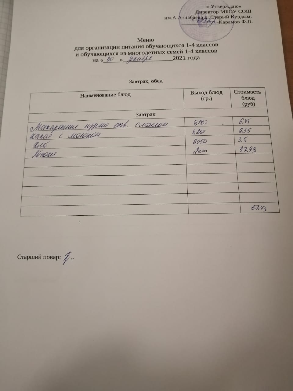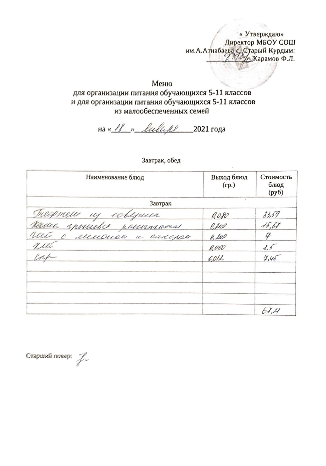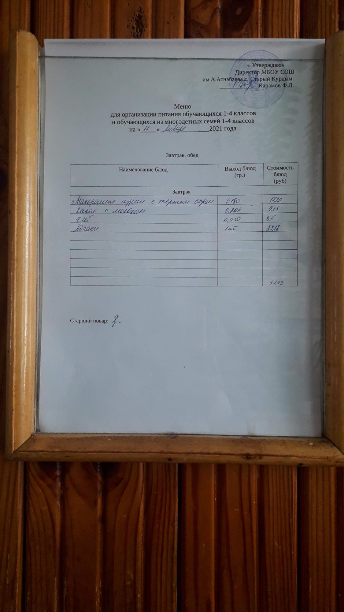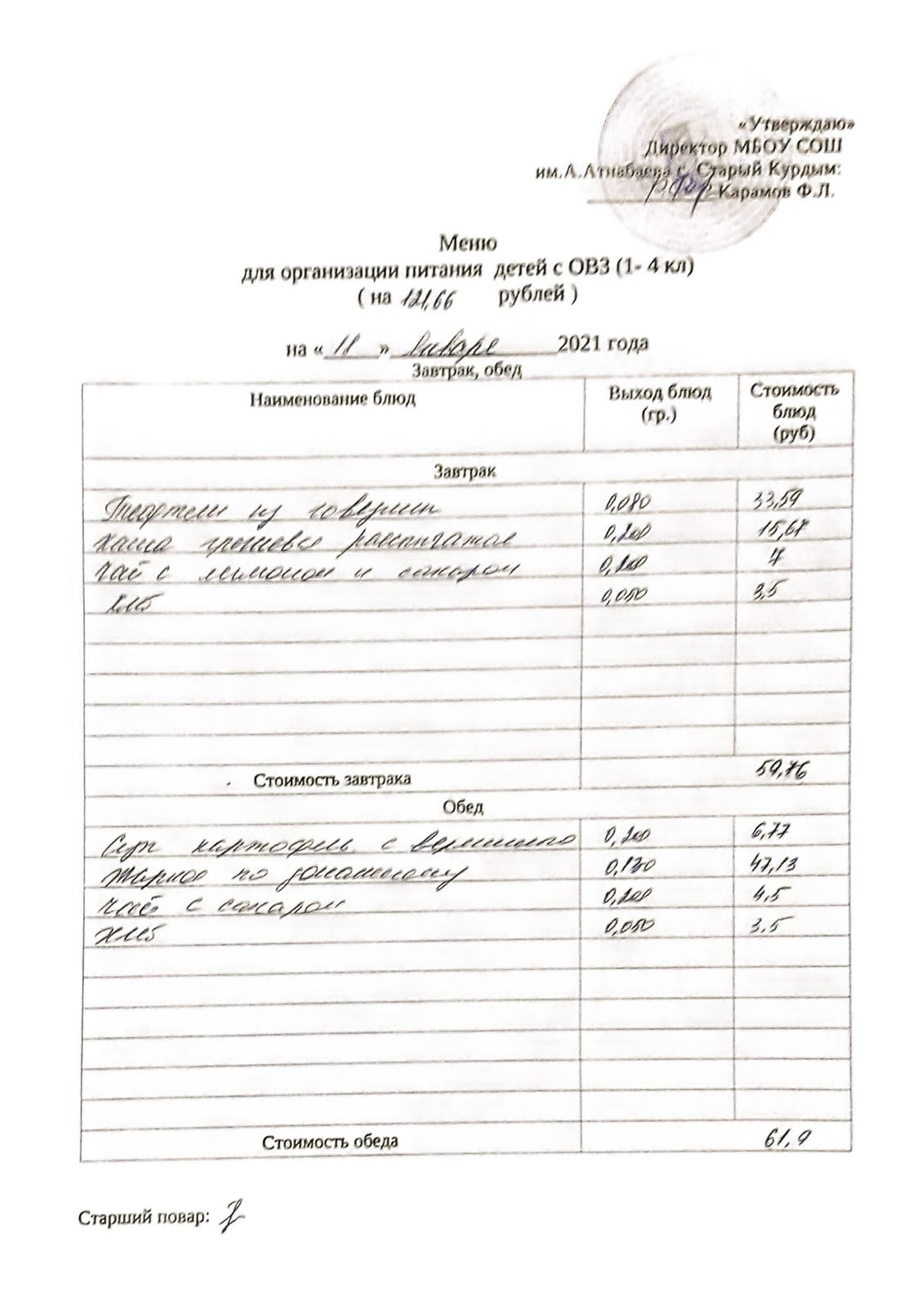 Стоимость школьного питания