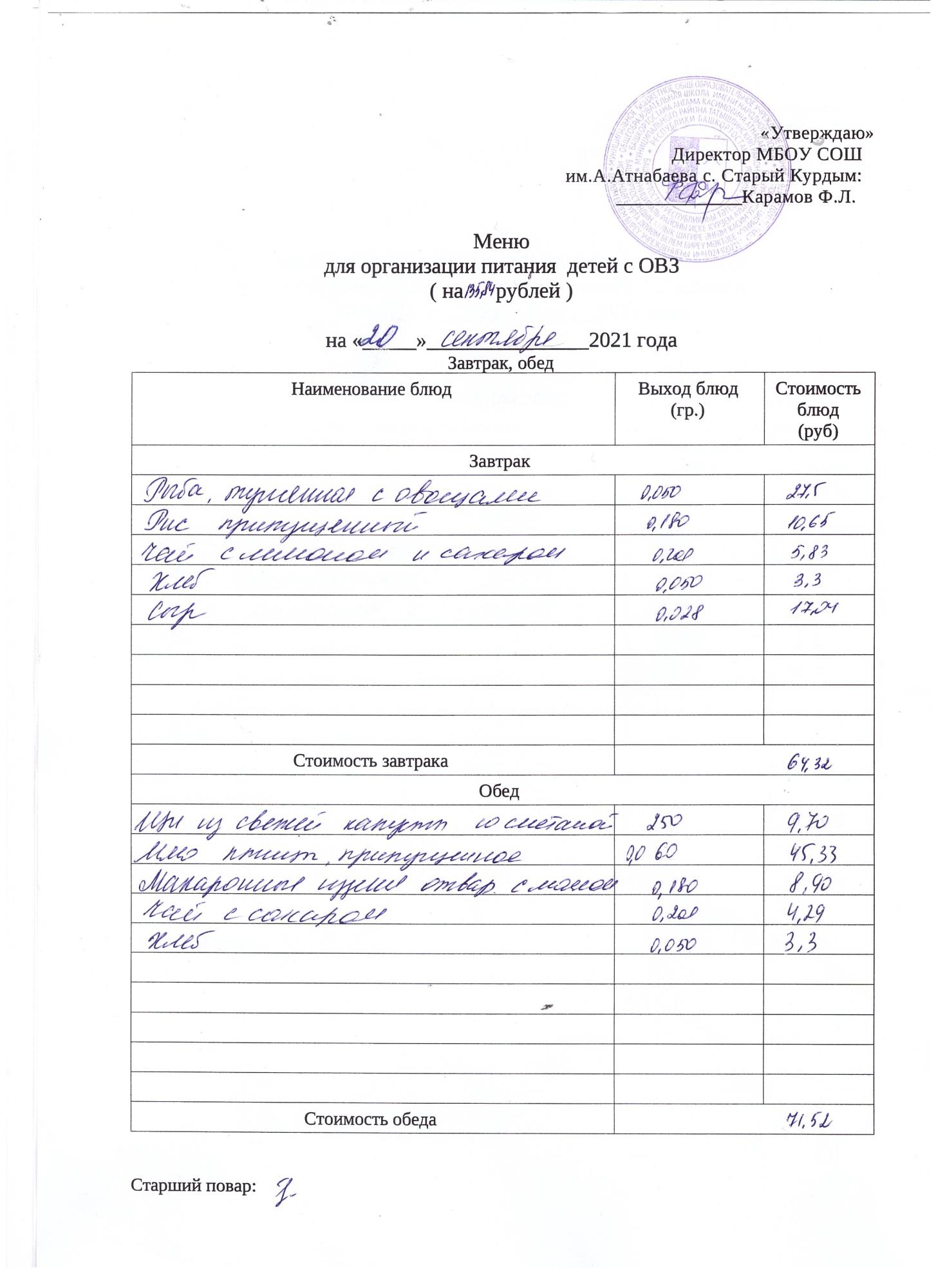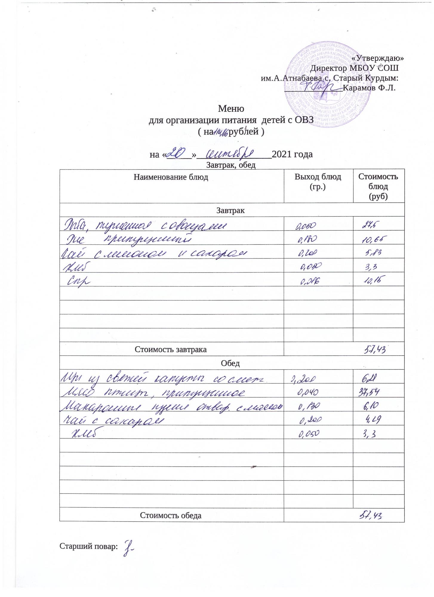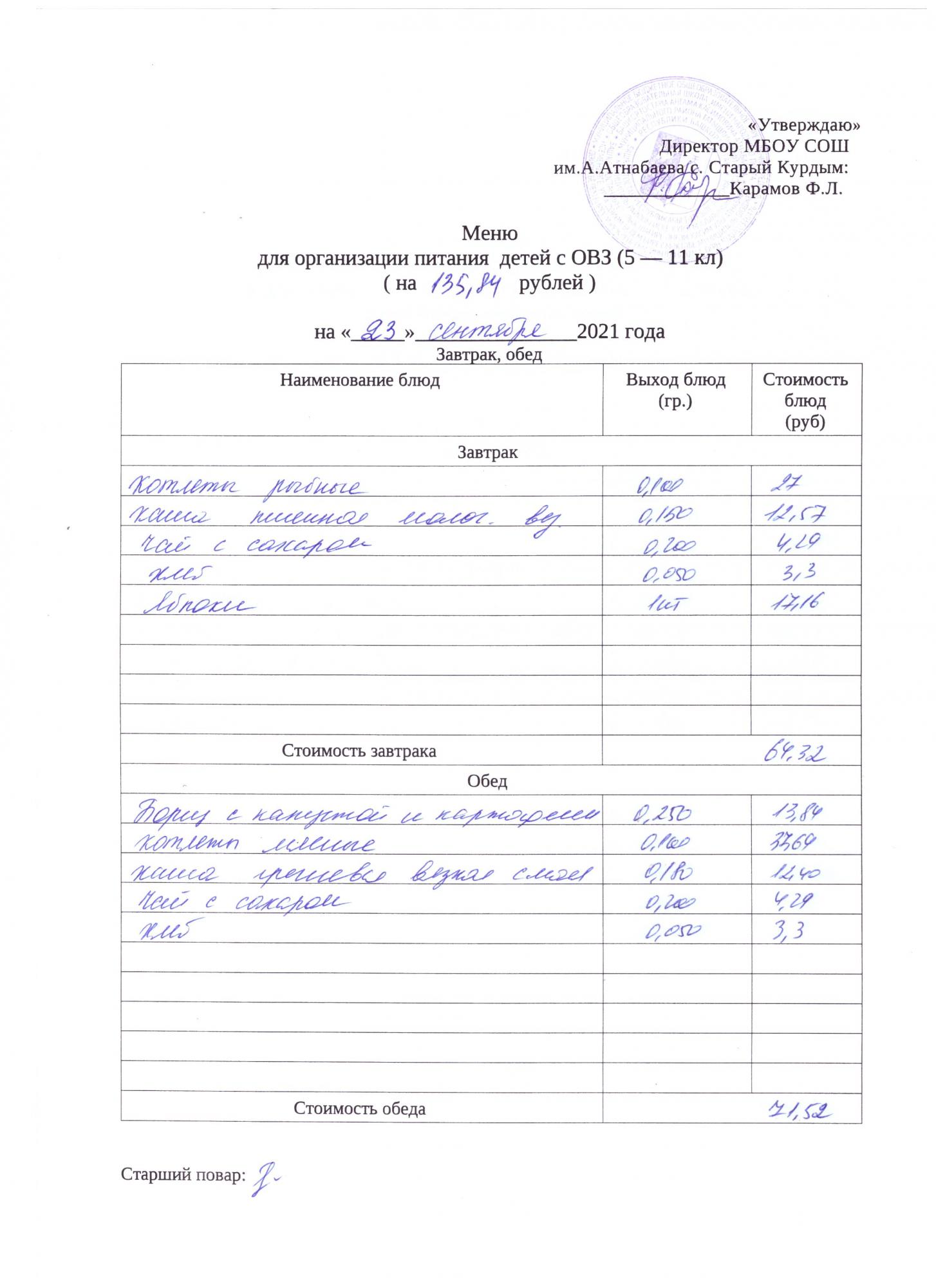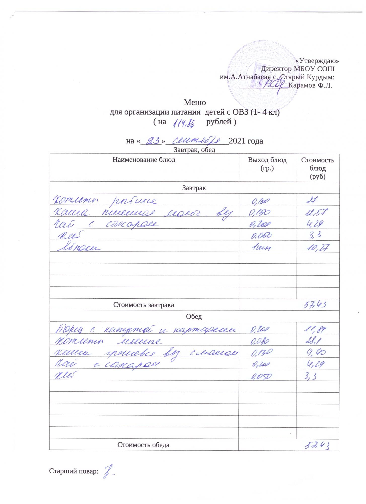 Стоимость школьного питания