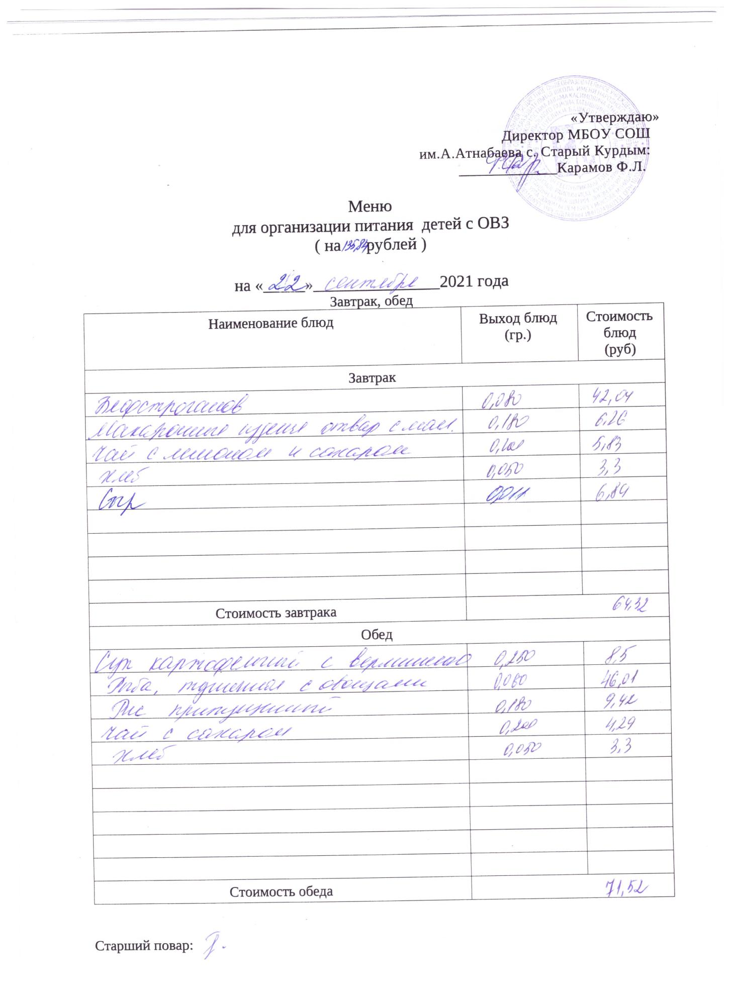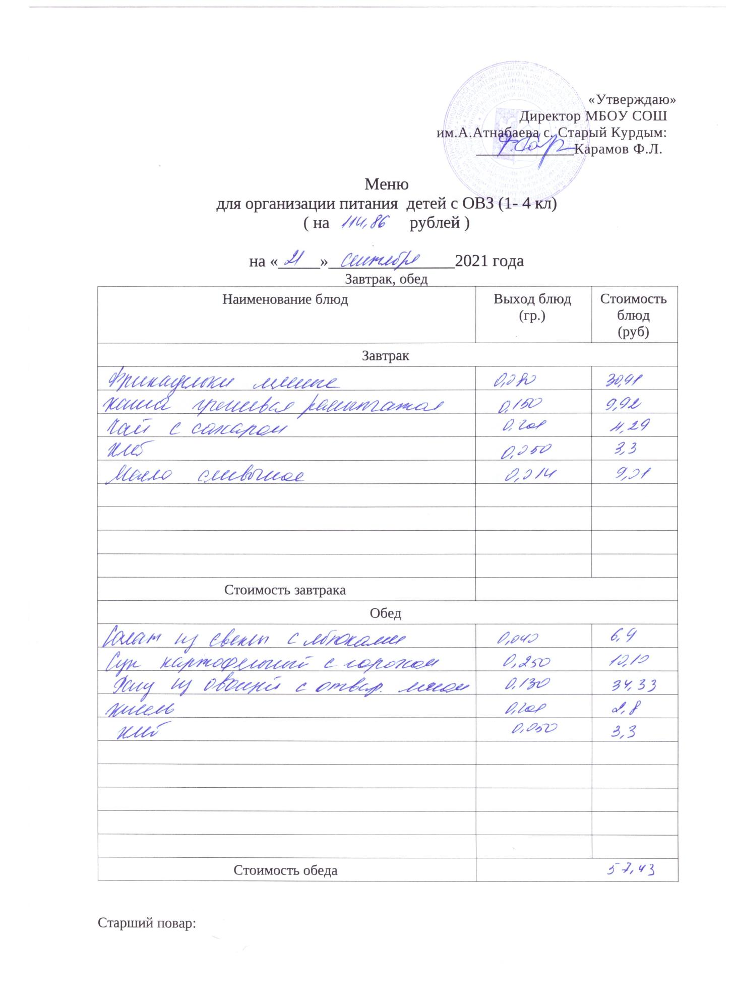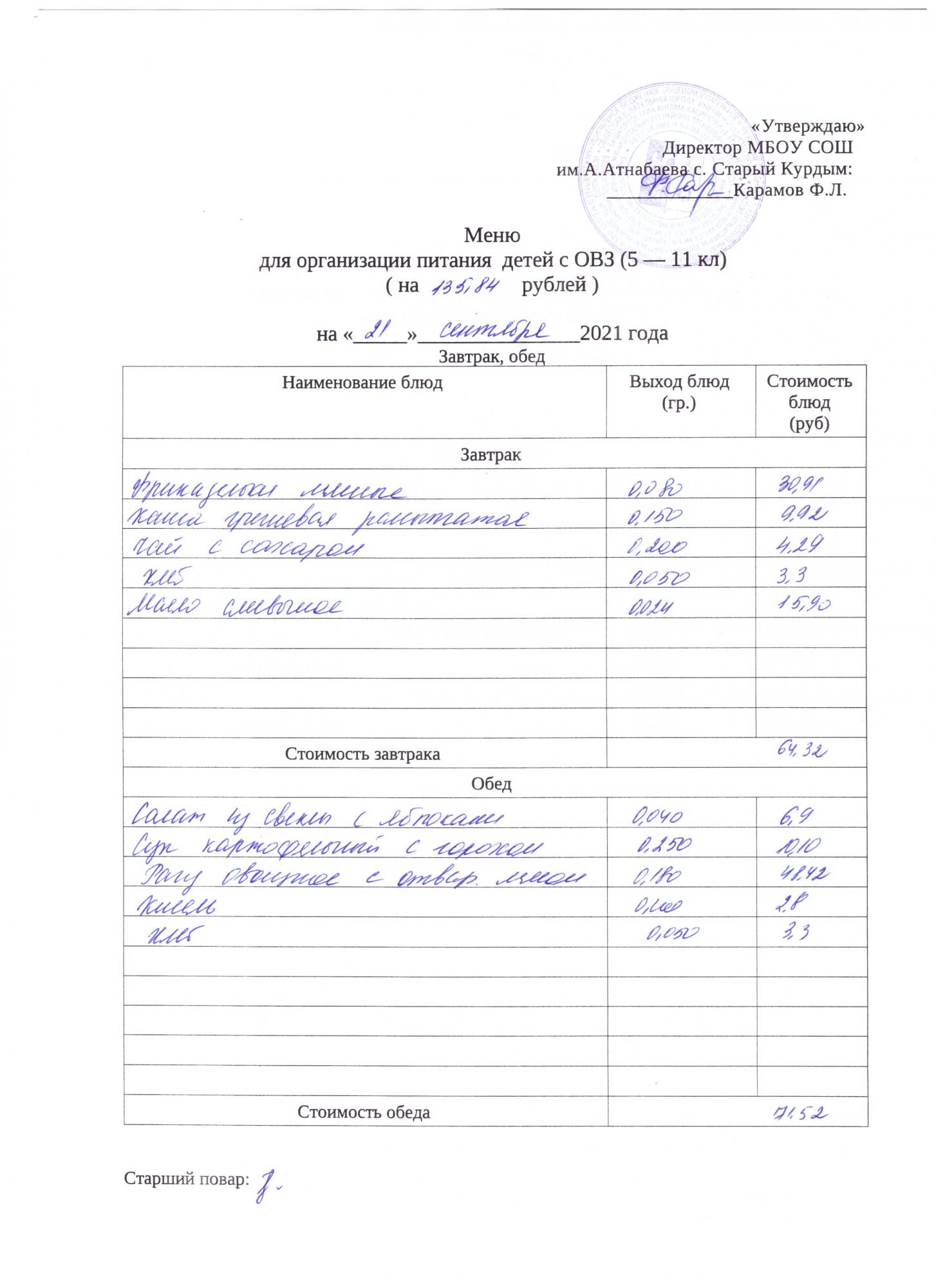 Стоимость школьного питания