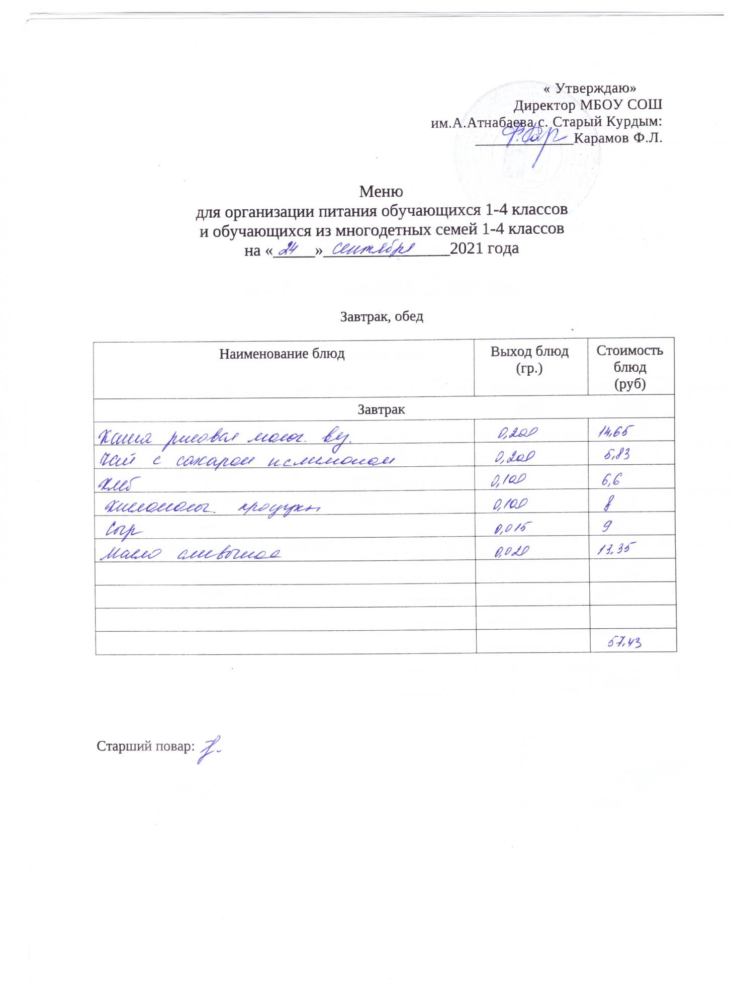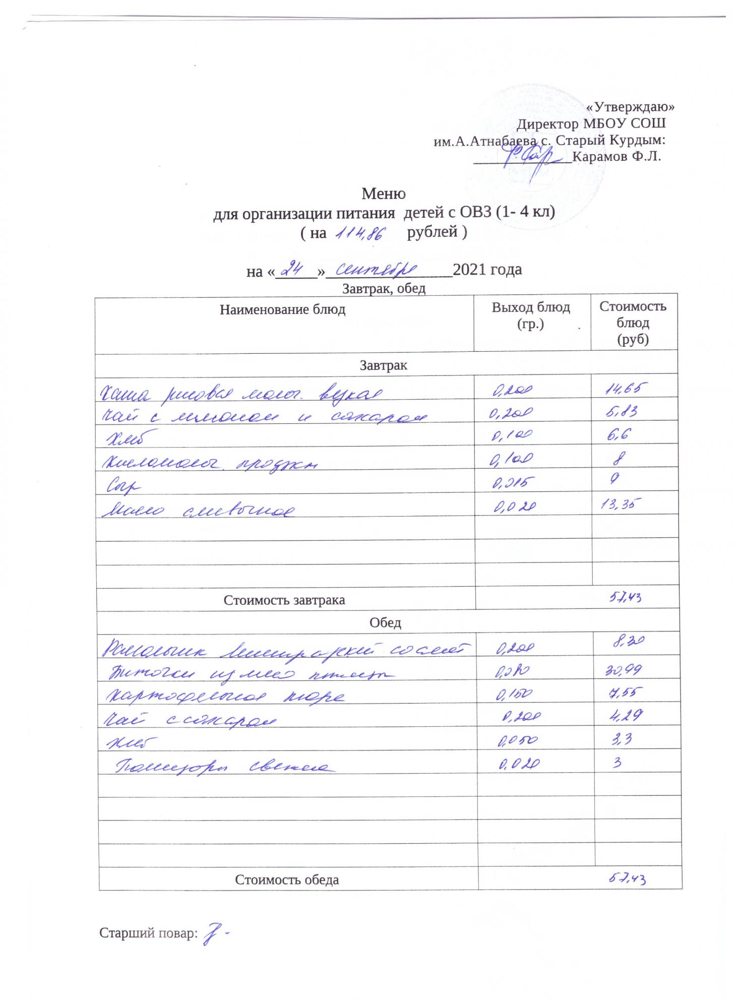 Примерное меню