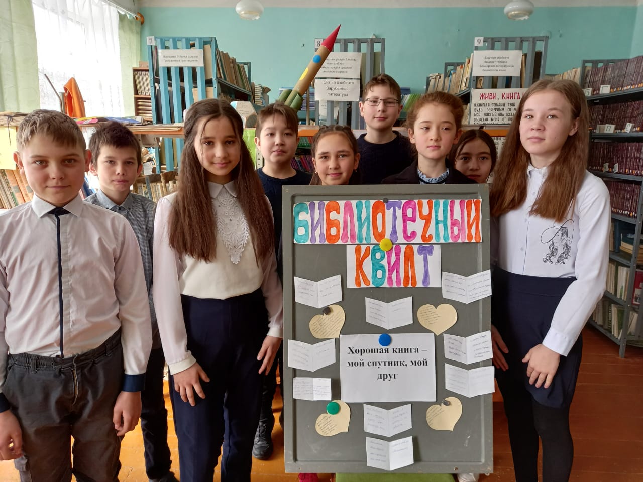Библиотечный квилт на тему "Хорошая книга-мой спутник,мой друг" с обучающимися 6 класса в рамках недели детской и юношеской книги.Провела библиотекарь школы Султанова Ф.В.