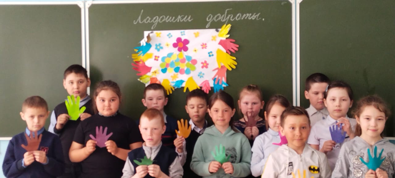 На творческом уроке вместе с педагогом - психологом Шариповой Э.Ф. учащиеся 2 класса изготовили выставку " Ладошки доброты". Участники оставили своё послание - маленькие бумажные ладошки, символизирующие счастливое мирное детство .Ладошка - это детский символ мира, дружбы, доброты и открытости.Данный урок мотивирует детей к совершению добрых поступков, умению благодарить ближнего.Учит анализировать свои и чужие поступки, осознавать важность совершения добрых дел.