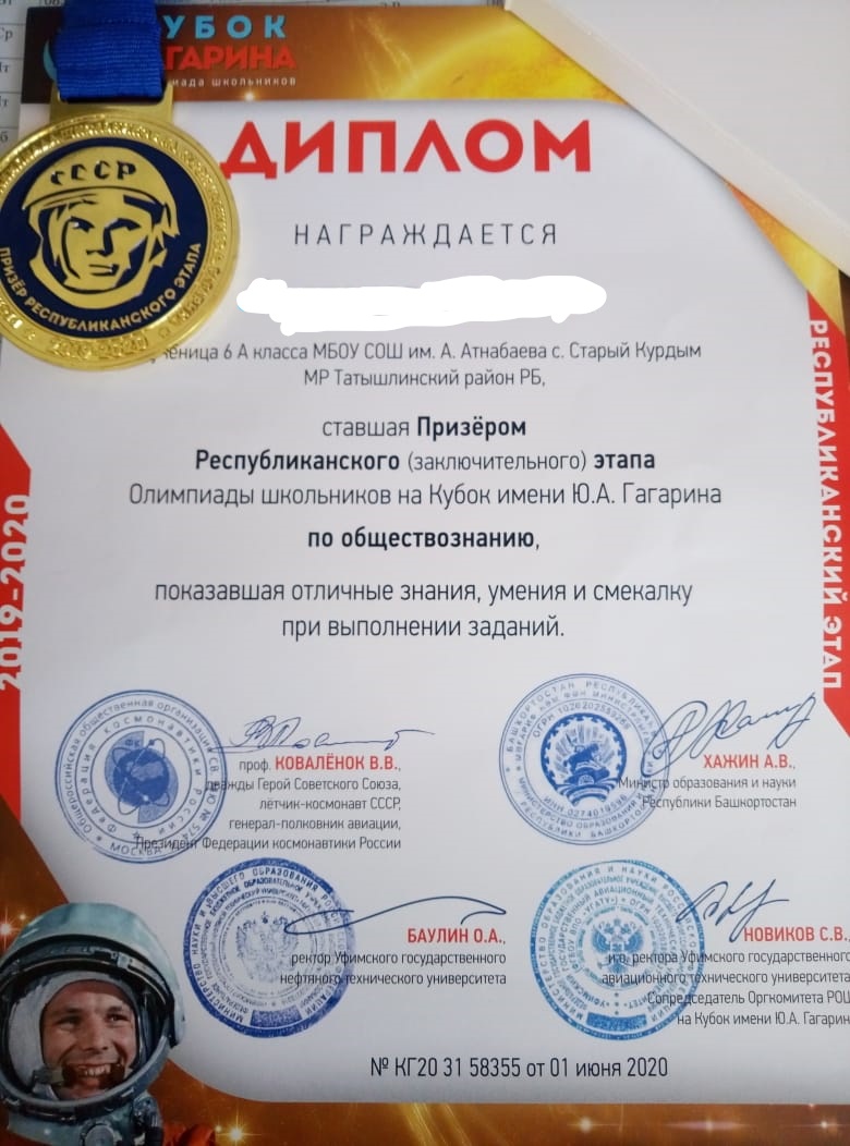 Призер Республиканского этапа олимпиады школьников на Кубок Ю. А. Гагарина