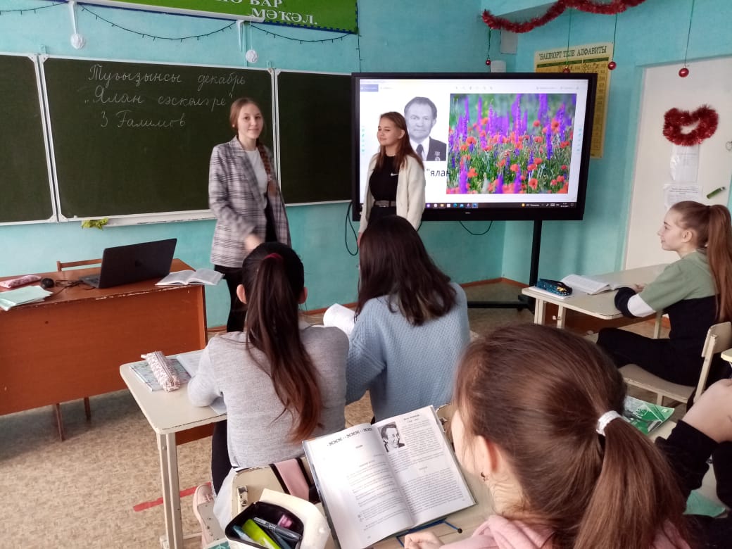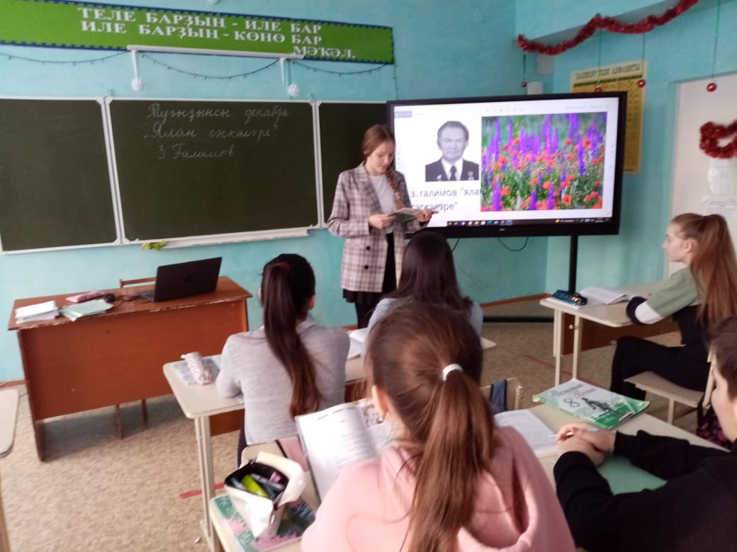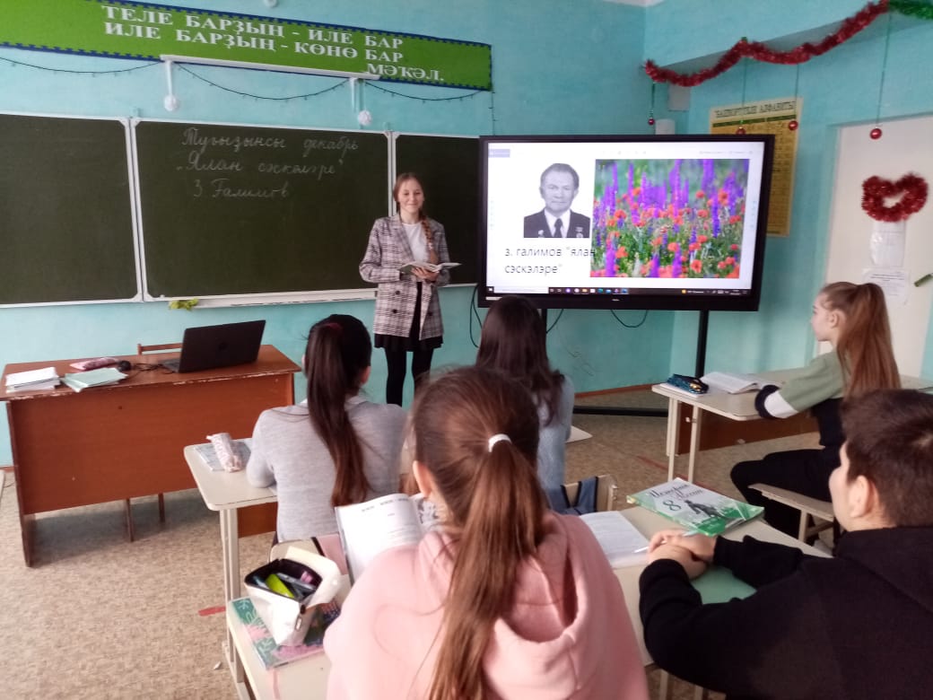 8 синыфта Солтанова Динара Зиннәт Ғалимовтың “Ялан сәскәләре”әҫәре буйынса дәрес үткәрҙе. Ул Зиннәт Ғалимовтың тормошо һәм ижады менән таныштырҙы. “Ялан сәскәләре” әҫәренең идея – тематик йөкмәткеһен астылар, ауыр аңлашылмаған һүҙҙәрҙең аңлатмаһын билдәләнеләр.
